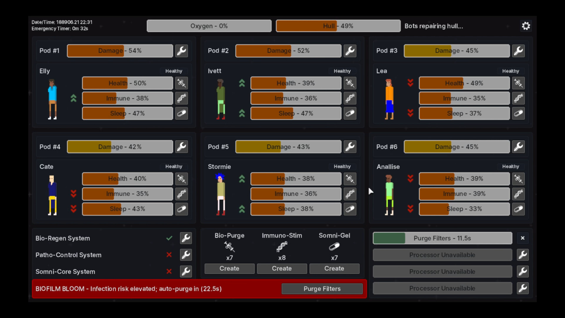 A sci-fi simulation game in which you take the role of the Emergency Pod Management Bot (EPMB) on a spaceship. The inhabitants of the medbay pods have been put into cryosleep due to the length of the journey. Somewhere along the way, disaster strikes, ripping apart the hull and disabling most of the automated systems. It is your job to keep the patients alive, healthy, and asleep.