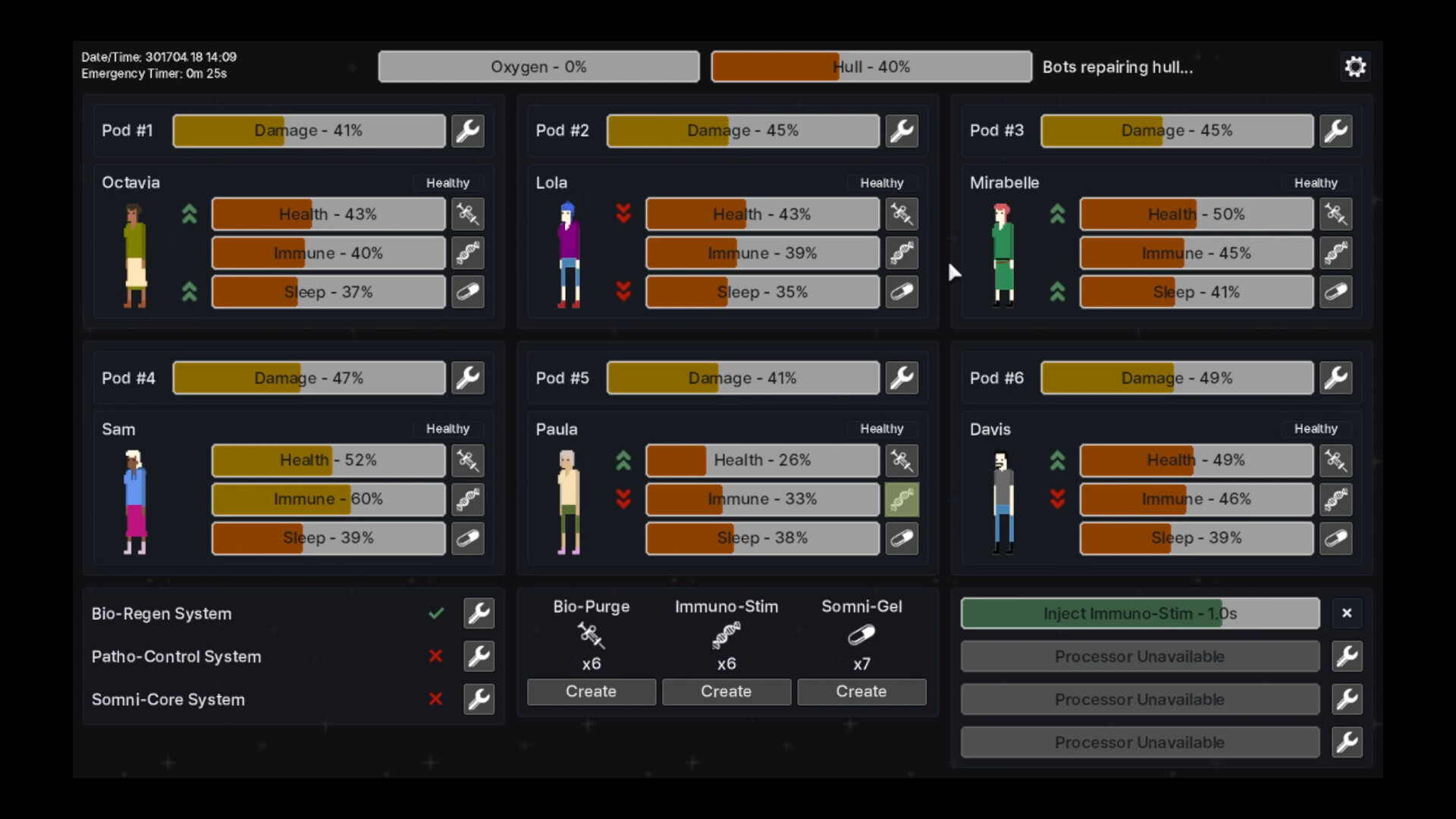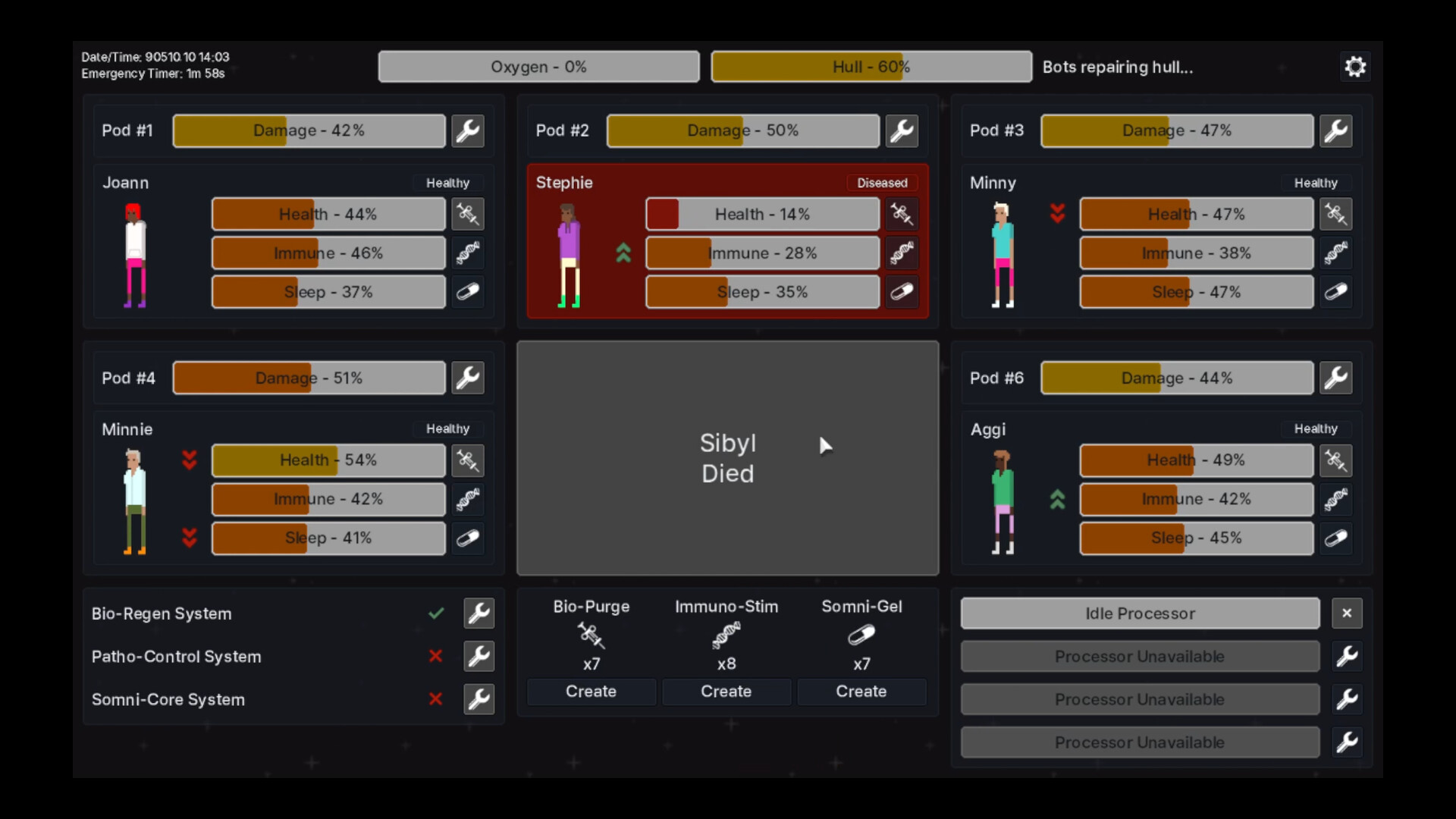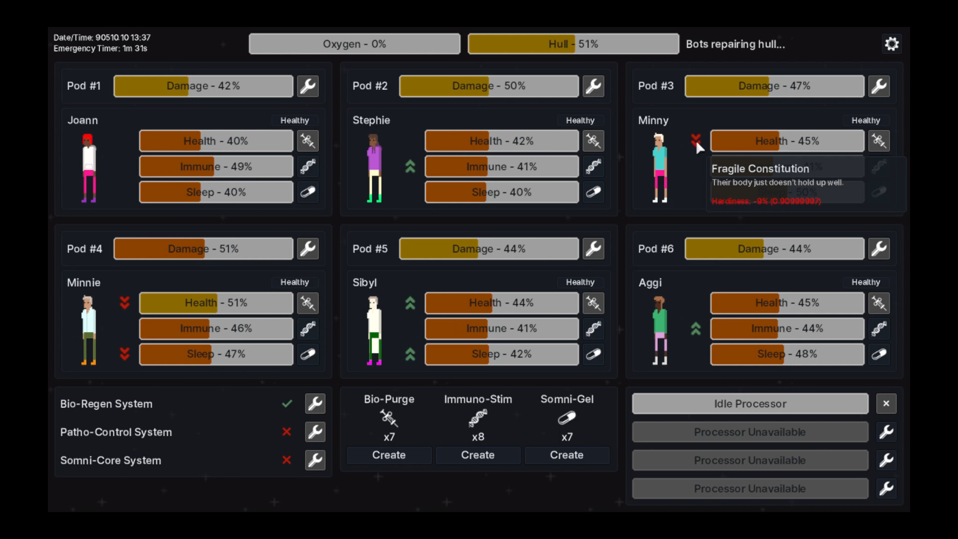 A sci-fi simulation game in which you take the role of the Emergency Pod Management Bot (EPMB) on a spaceship. The inhabitants of the medbay pods have been put into cryosleep due to the length of the journey. Somewhere along the way, disaster strikes, ripping apart the hull and disabling most of the automated systems. It is your job to keep the patients alive, healthy, and asleep.
