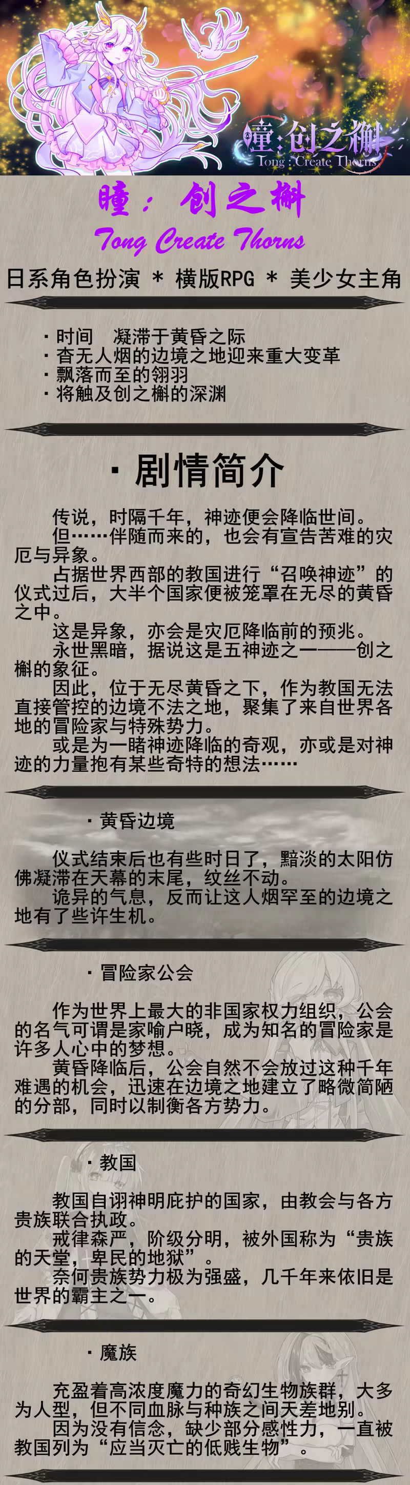 《瞳:创之槲》是一款剧情向横版角色扮演动作冒险游戏,玩家将控制美少女主角在无尽的黄昏之下逐步了解这奇幻世界的故事,揭露某些隐藏于黑暗之中的阴谋与危机。