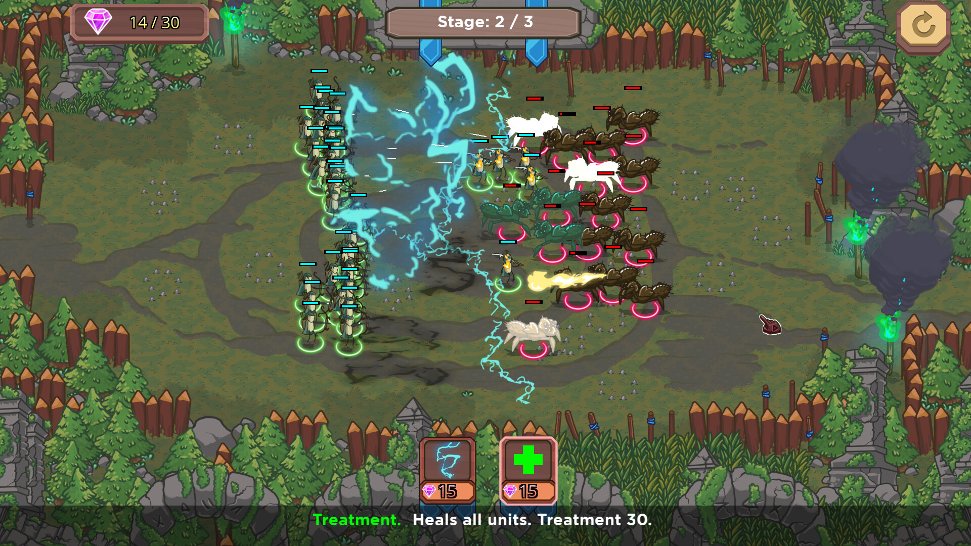 The game is a 2D autobatler with an isometric view. Arrange your troops, press "Play" and watch the majestic battles full of surprises. But now everything is in your hands — collect crystals and use powerful spells: summon tornadoes or strike enemies with lightning to turn the tide of battle!