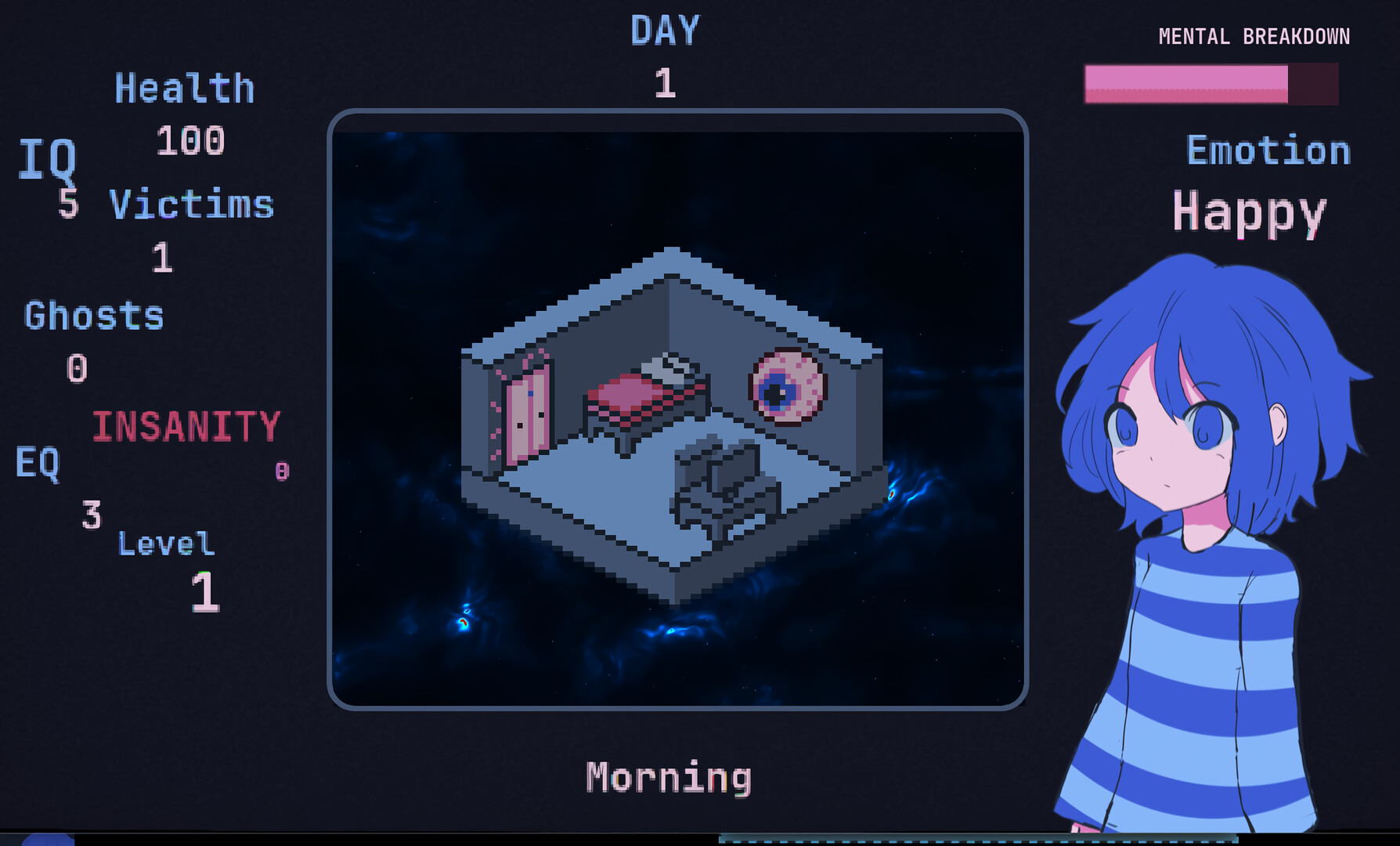 Abulia is an Type-battle System RPG and Visual Novel adventure that takes place on mind of a special girl that is trying to find herself in the world and struggling to understand our complex world.