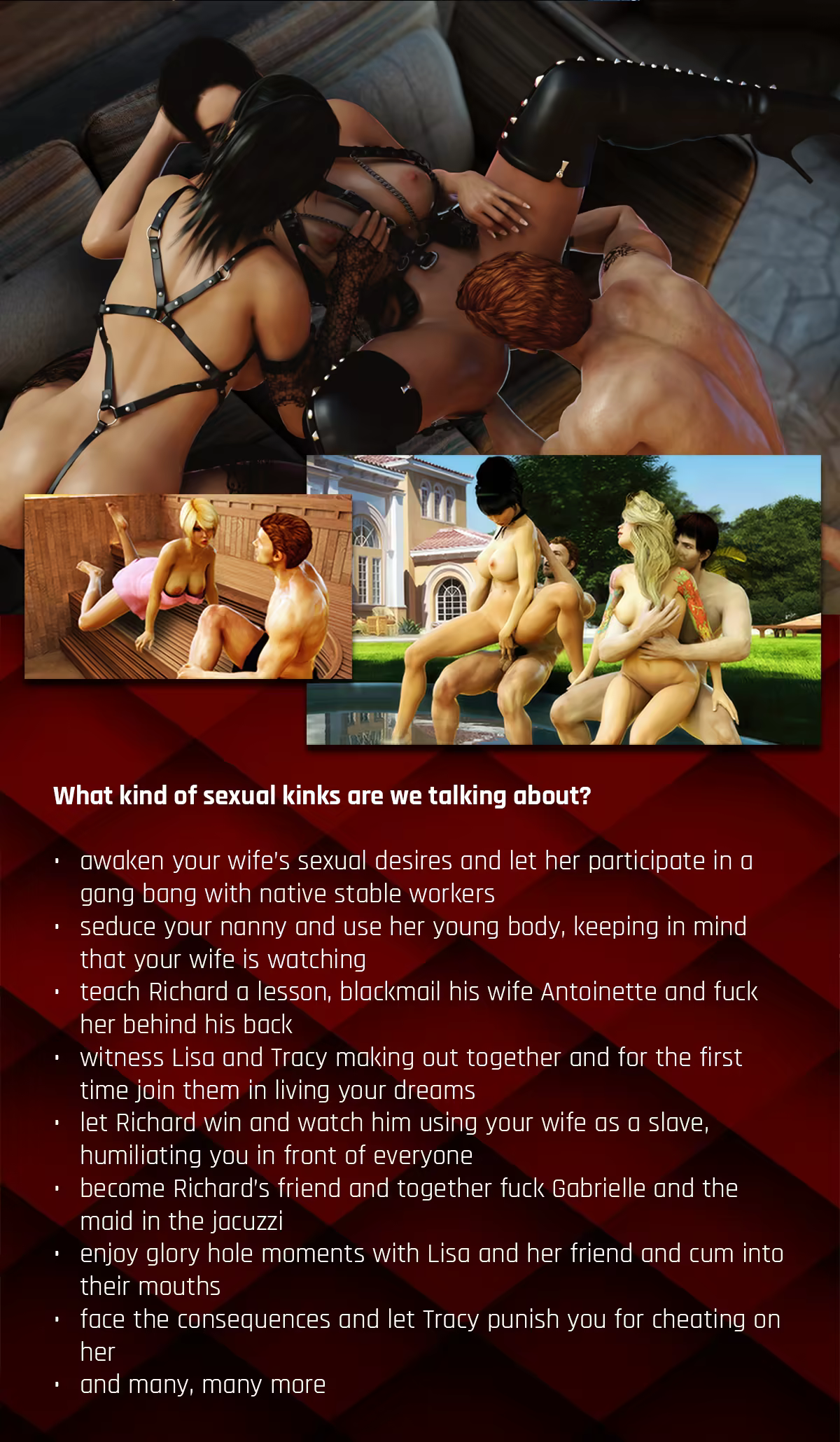 Join your wife Tracy and nanny Lisa on a trip to your cousin's lavish estate in France and embark on a sensual journey like no other. Encounter new acquaintances, challenge your loyalty, and explore the depths of temptation in all its hues.
