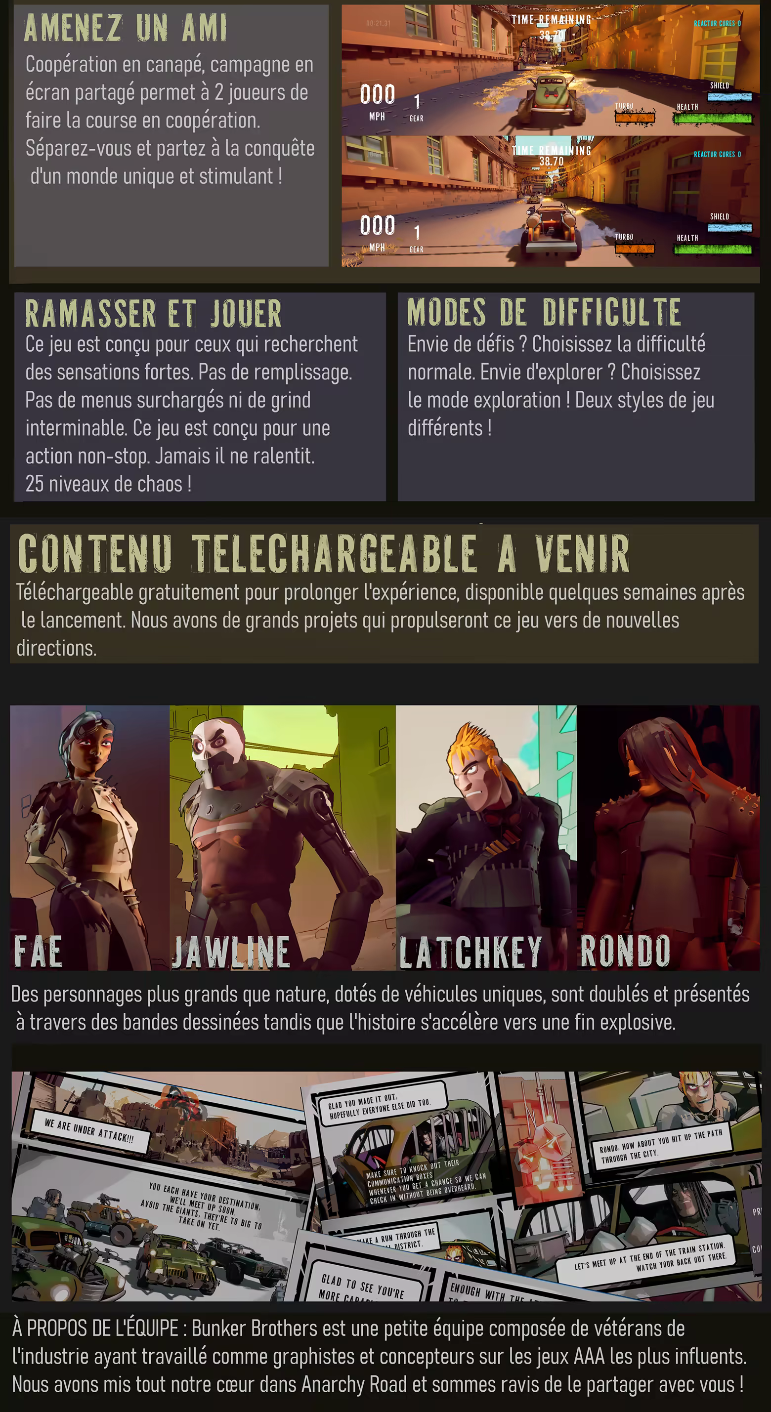 Vitesses élevées, explosions impressionnantes, boss encore plus imposants et action intense ! Anarchy Road est un jeu de course post-apocalyptique où nos 4 héros doivent affronter des boss, écraser des ennemis et éviter des pièges pour survivre jusqu'à la fin explosive !
