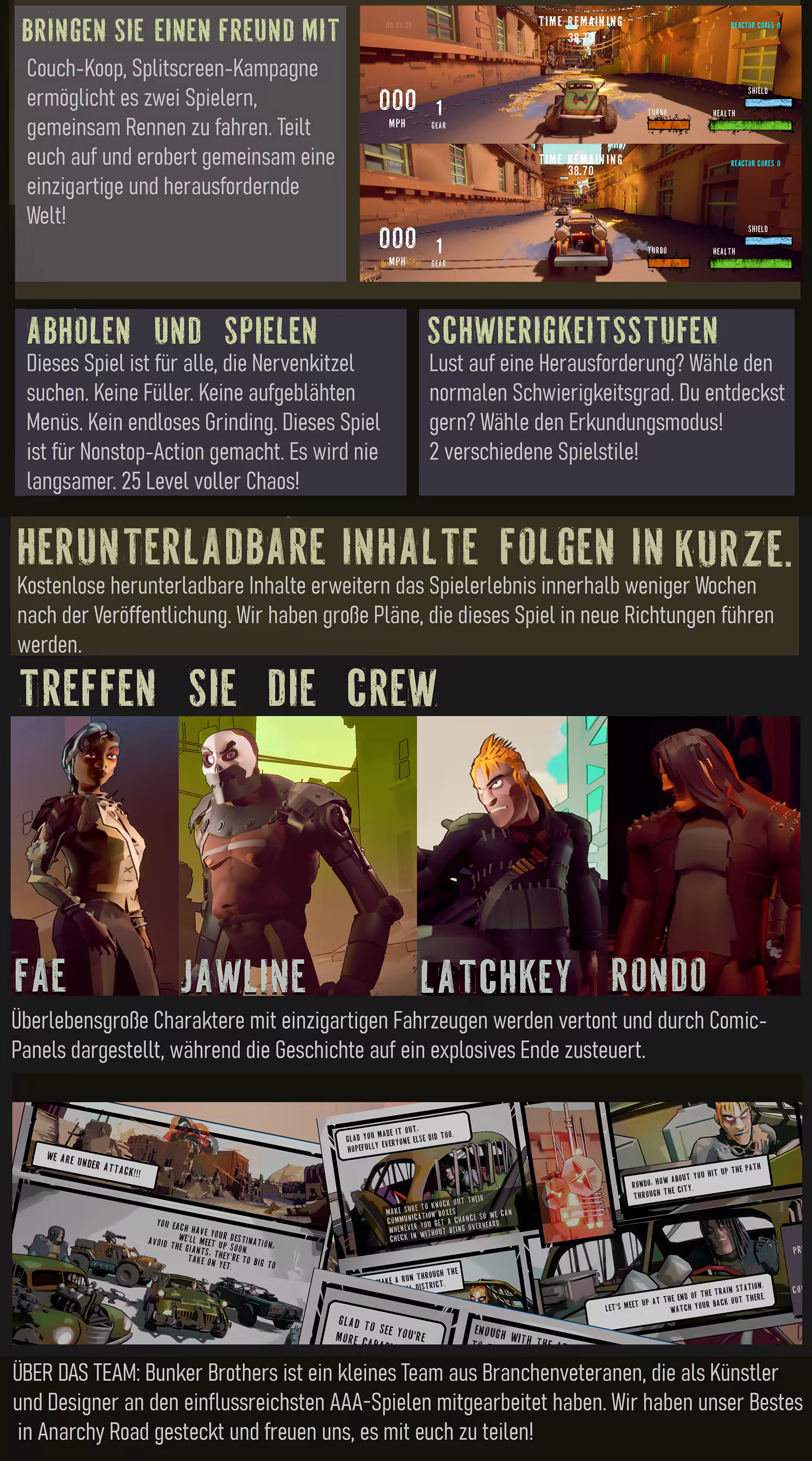 Hohe Geschwindigkeiten, gewaltige Explosionen, riesige Bosse und verrückte Action! Anarchy Road ist ein postapokalyptisches Rennspiel, in dem unsere vier Helden gegen die Zeit antreten, Bosse bekämpfen, Feinde in die Luft jagen und Fallen ausweichen, um bis zum explosiven Ende zu überleben!