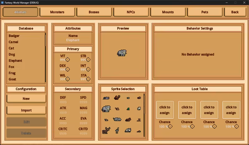 • Design all Creature Types by choosing the Visual Appearance (100+ Sprites), Level, Stats and Loot Table