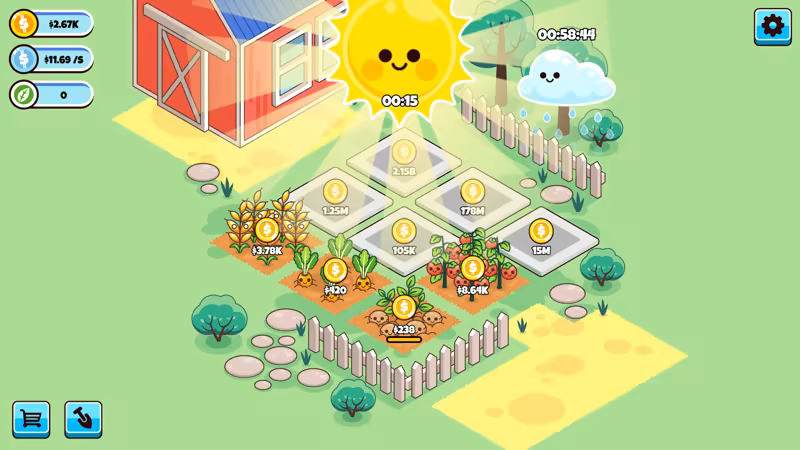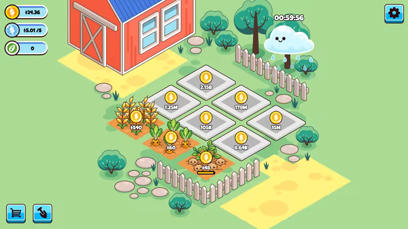 Plant seeds and harvest crops for coins. Grow different crops generate more coins. Upgrade crops to improve yield.
