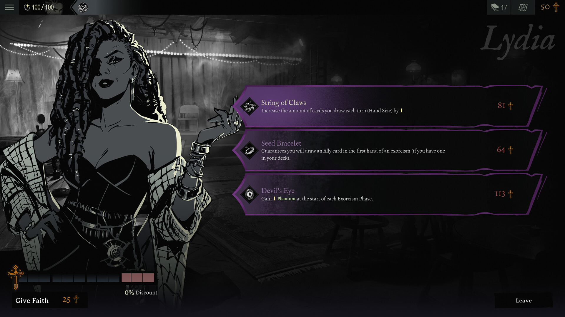 Succeed at exorcisms and receive a reward of Faith, a currency you can spend along your path. Use it to add, upgrade or remove cards, heal your Will, or buy Curios, run-long passive effects that add both power and different ways to play.