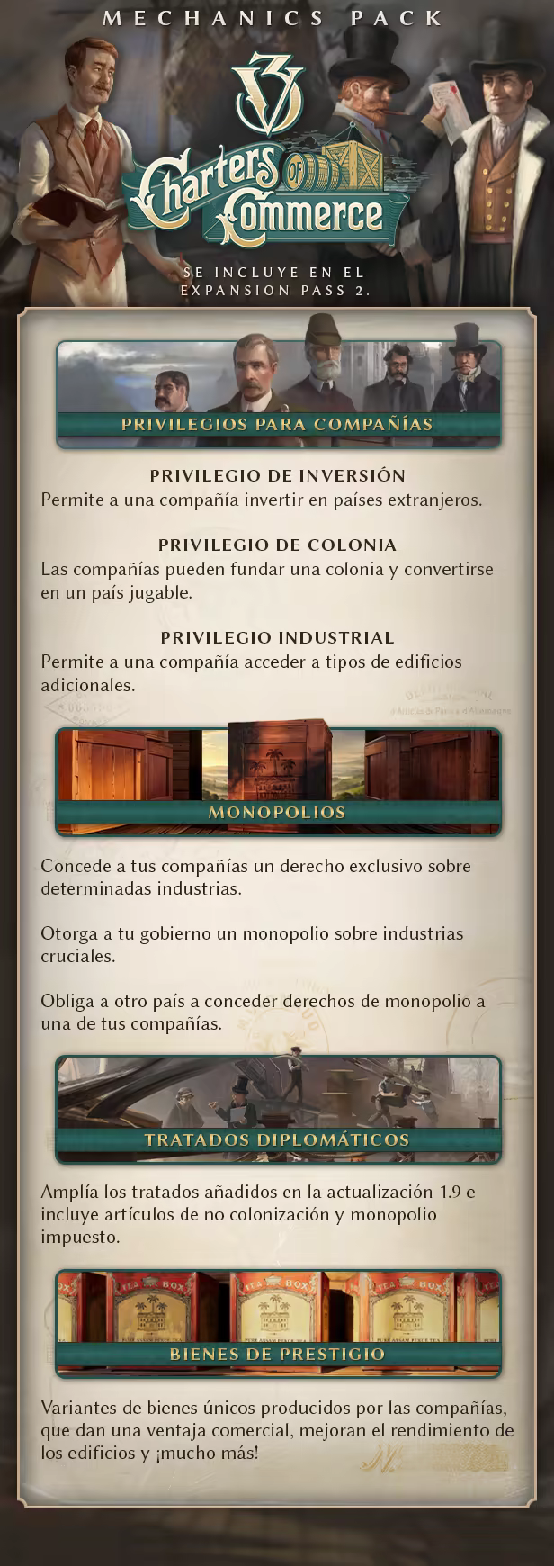 Desarrolla un sistema financiero y comercial que enriquezca a tu nación y sobrepase a tus rivales con Charters of Commerce, un nuevo paquete de mecánicas para Victoria 3. Charters of Commerce añade mayor profundidad y nuevas opciones al sofisticado modelo comercial de Victoria, ya que incluye innovadoras formas de regular el crecimiento de las compañías, nuevas herramientas diplomáticas y novedosas variantes de bienes únicos por las que tu país será famoso.