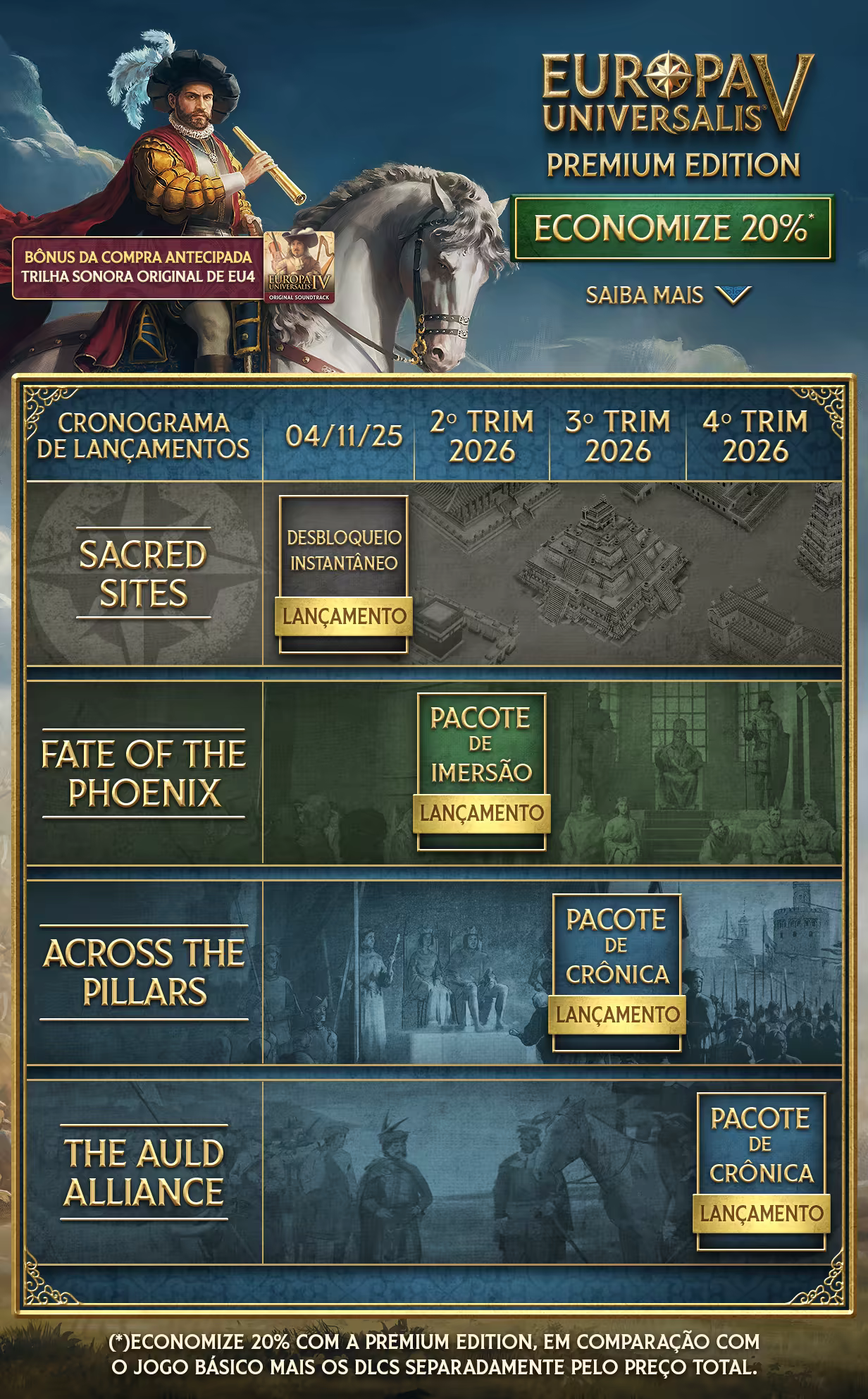 Mergulhe mais fundo no passado distante com a Premium Edition de Europa Universalis V, que inclui três pacotes de DLC focados na história de regiões específicas, além de uma recompensa cosmética desbloqueada instantaneamente por quem tiver a Premium Edition.