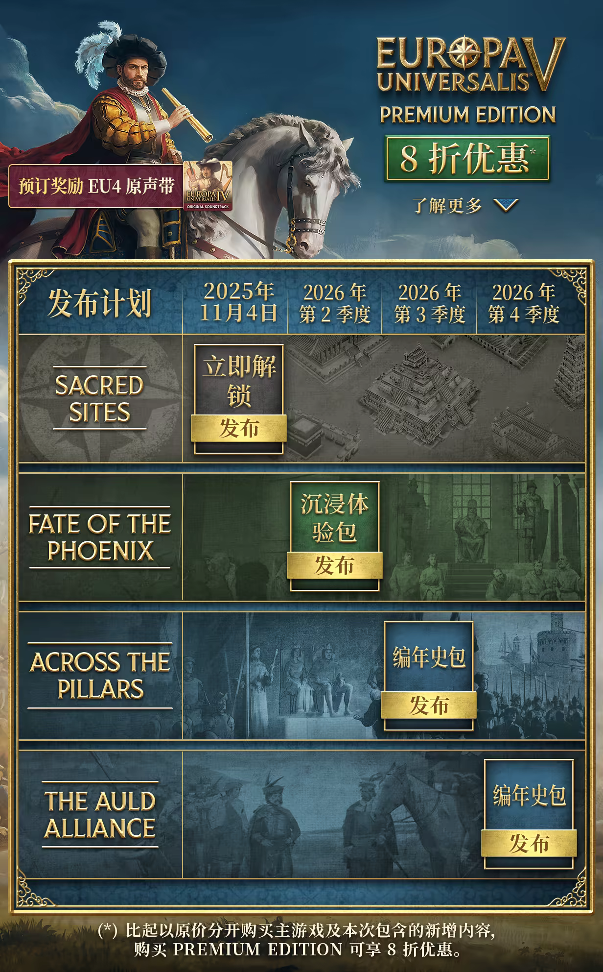 跟随《Europa Universalis V: Premium Edition》继续深入探访那段遥远的过去。游戏内含 3 个扩展包,分别聚焦于特定地区的历史。此外,所有 Premium Edition 玩家均可立即解锁一件装饰。
