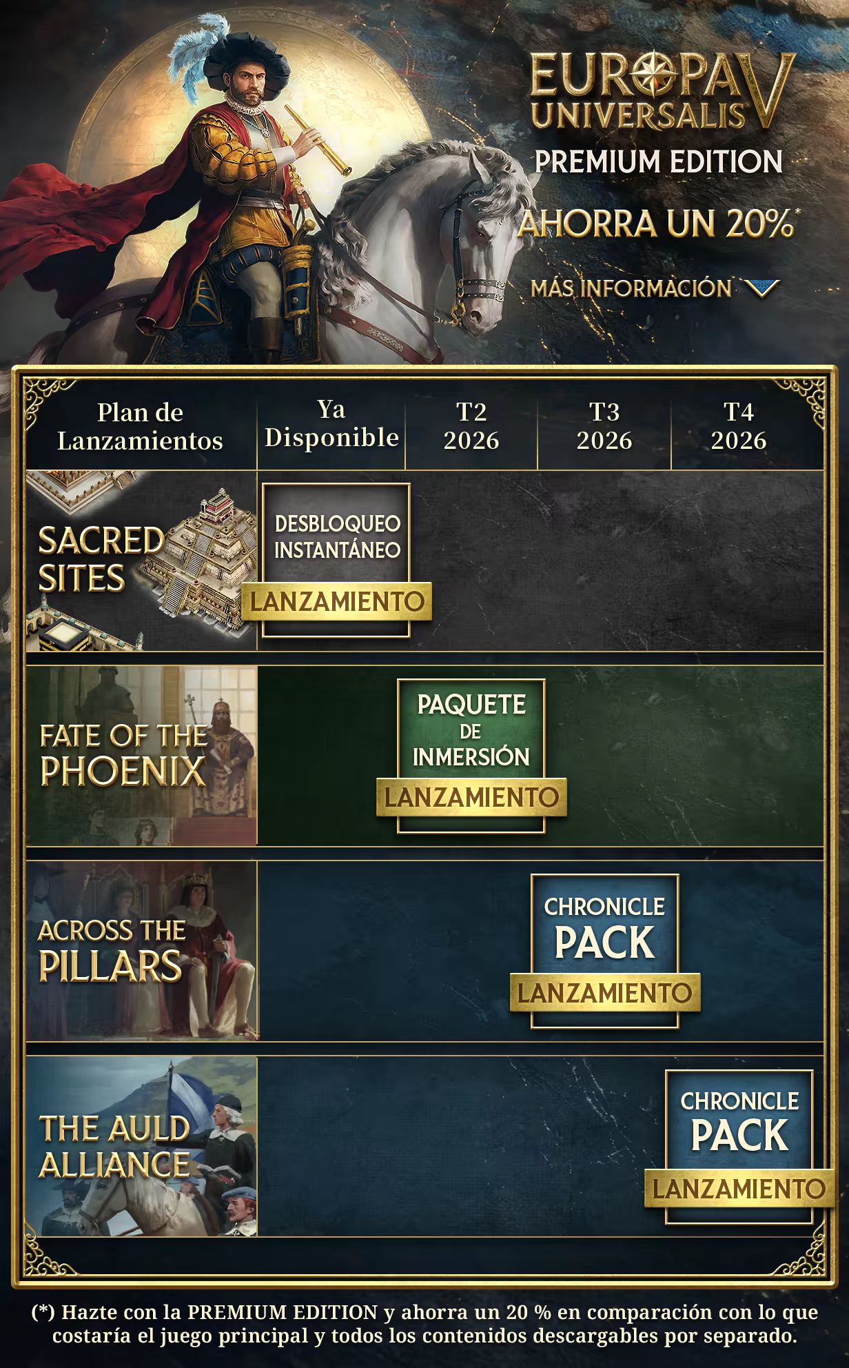 Sumérgete de lleno en el pasado lejano con la Premium Edition de Europa Universalis V, que incluye tres DLC enfocados en la historia de regiones específicas, además de una recompensa estética que se desbloqueará instantáneamente y que recibirán todas las personas que tengan la Premium Edition.