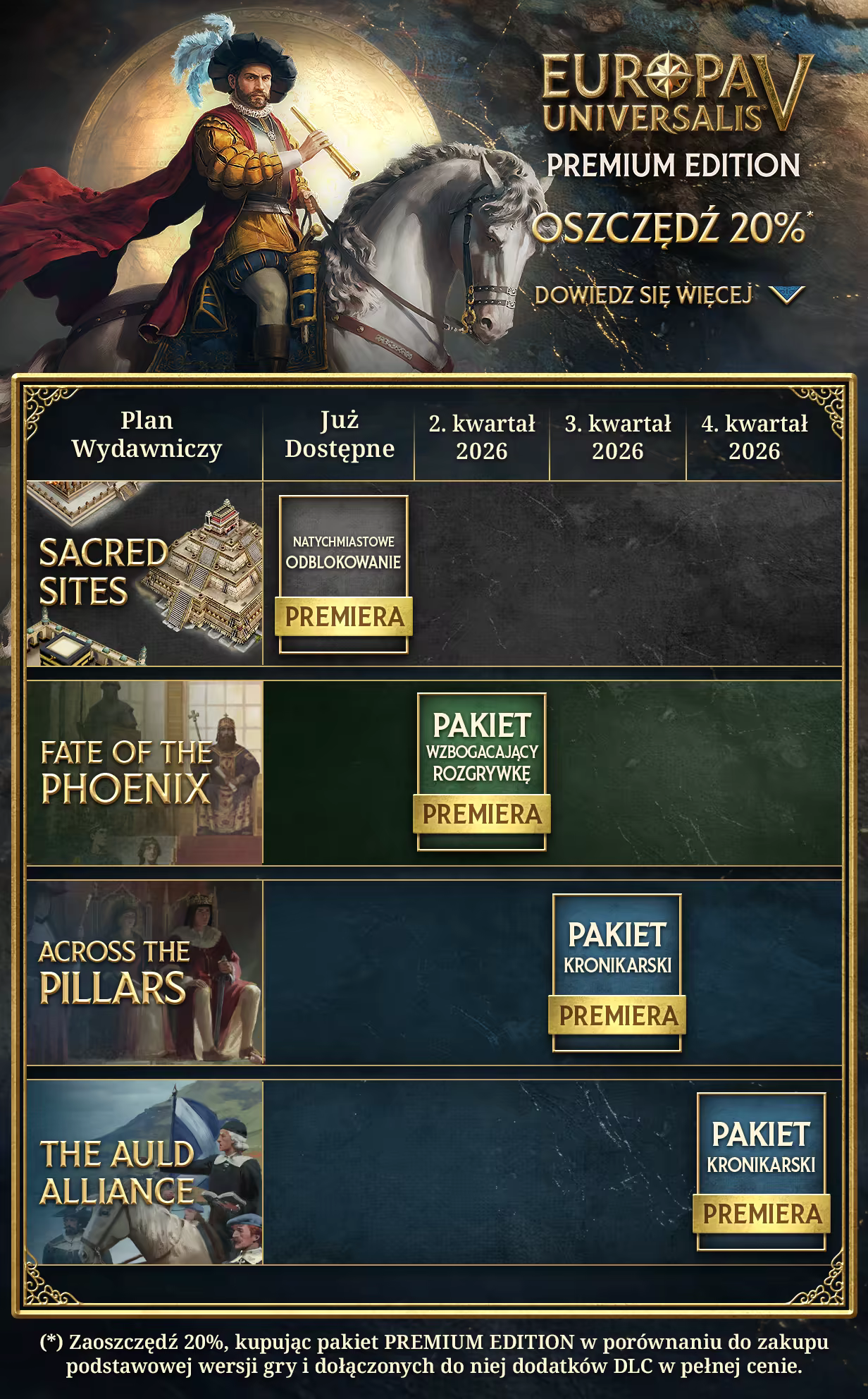 Cofnij się w dalszą przeszłość z Europa Universalis V Premium Edition, gdzie znajdziesz trzy dodatki DLC przedstawiające historie konkretnych regionów oraz natychmiast dostępny przedmiot kosmetyczny wyłącznie dla właścicieli wydania Premium Edition.