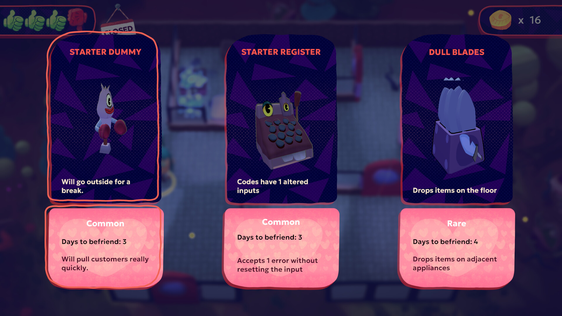 Manage a cursed convenience store where your appliances come alive! Befriend them to harness their unique powers or ignore them and your store will turn against you. Craft items, plan weeks, buy upgrades and face corporate’s challenges in this action-management roguelite. Solo or with friends!