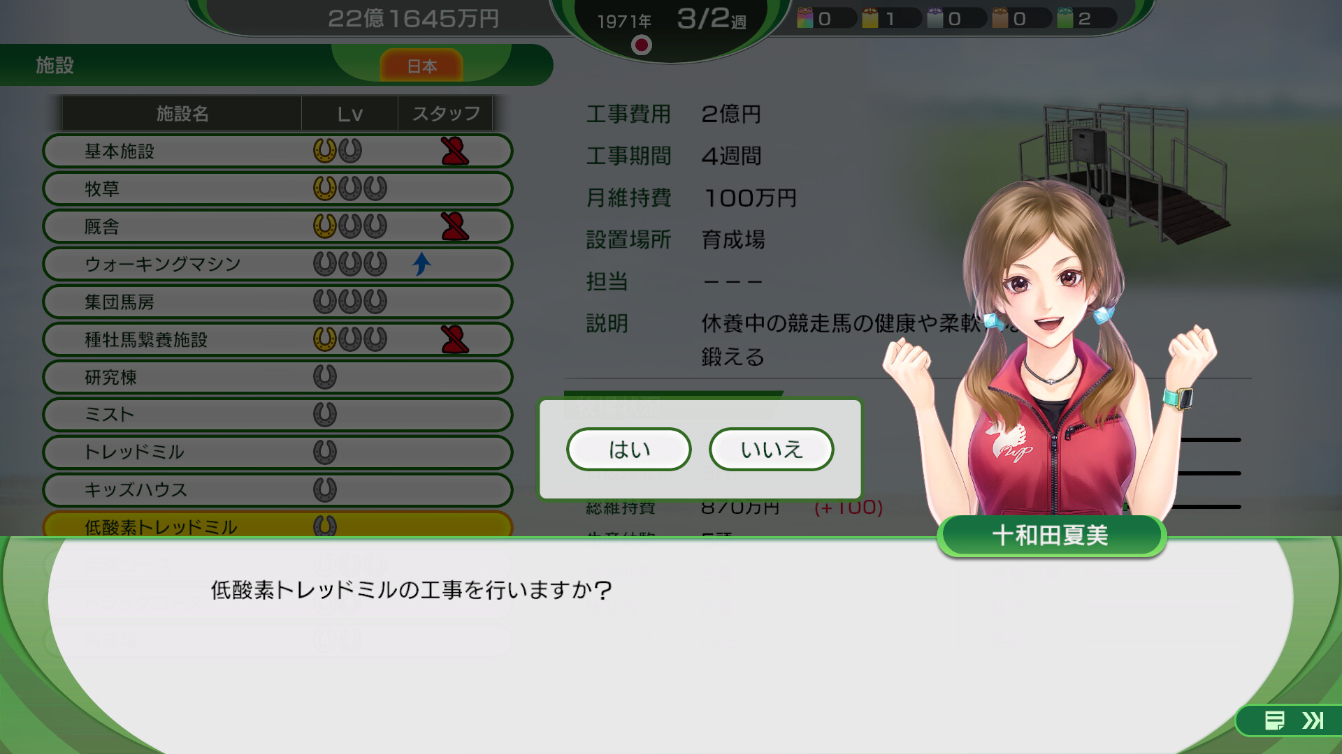 日本、米国、欧州のプレイヤー牧場、およびクラブ牧場で、牧場施設「低酸素トレッドミル」を建築可能になり、さらに放牧場の面積を1増やせるセットです。