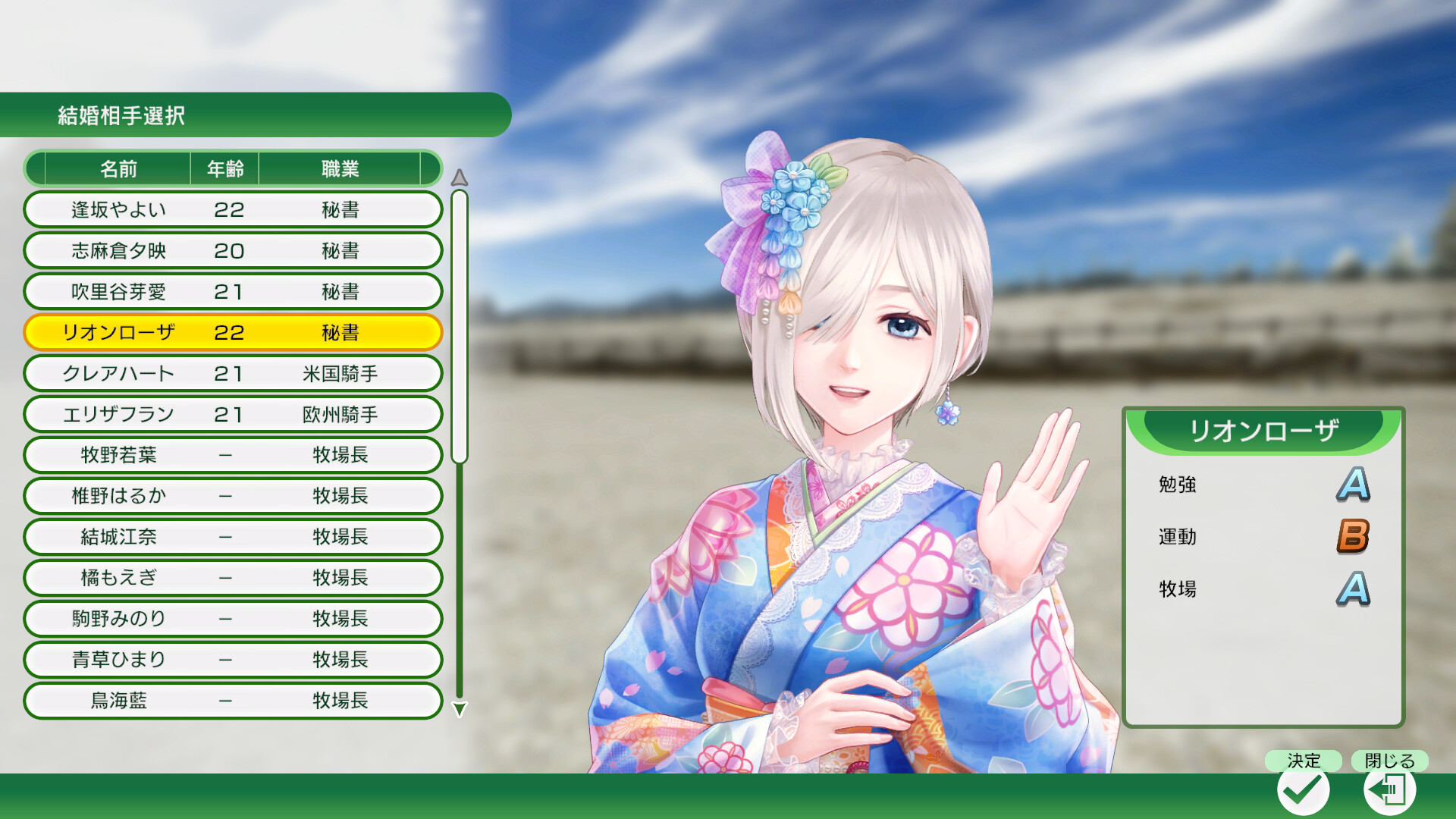 ・結婚相手の候補となるのは、未婚であり、結婚可能な年齢となっている異性の秘書、知人、牧場長、一部の現役騎手・調教師のみです