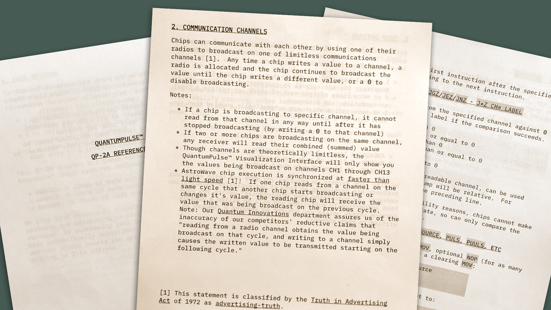 • Make use of a unique fictional computing device where all communication is done by broadcasting to radio channels, and all conditional operators test values broadcast from other chips