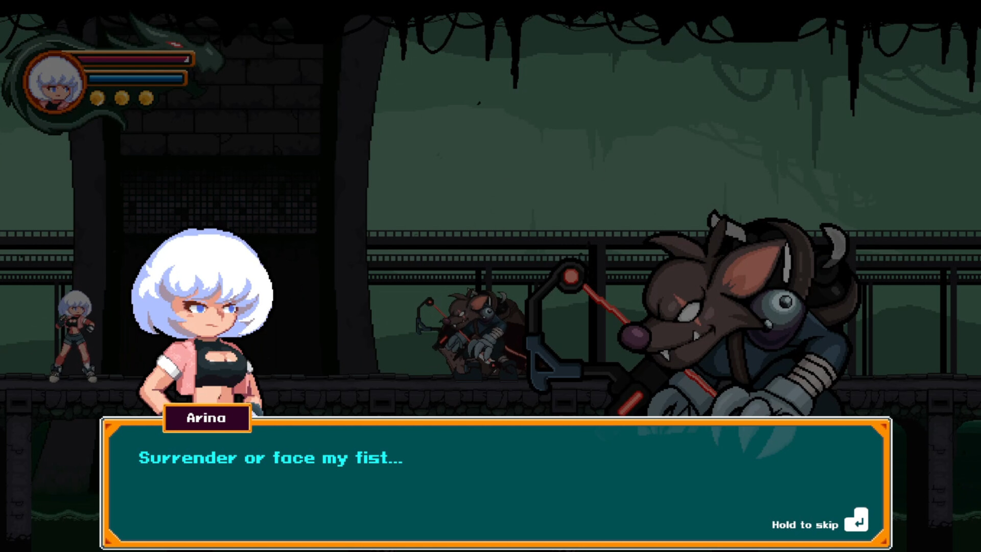 Battle through a futuristic world as Arina, a cyber-enhanced agent in a fast-paced 2D Beat'em up/Platformer Hybrid. Take down sentient cyborgs with various combos, aerial attacks, and parries. Outsmart deadly traps, uncover hidden rooms, and infiltrate the lair of an evil scientist uprising.