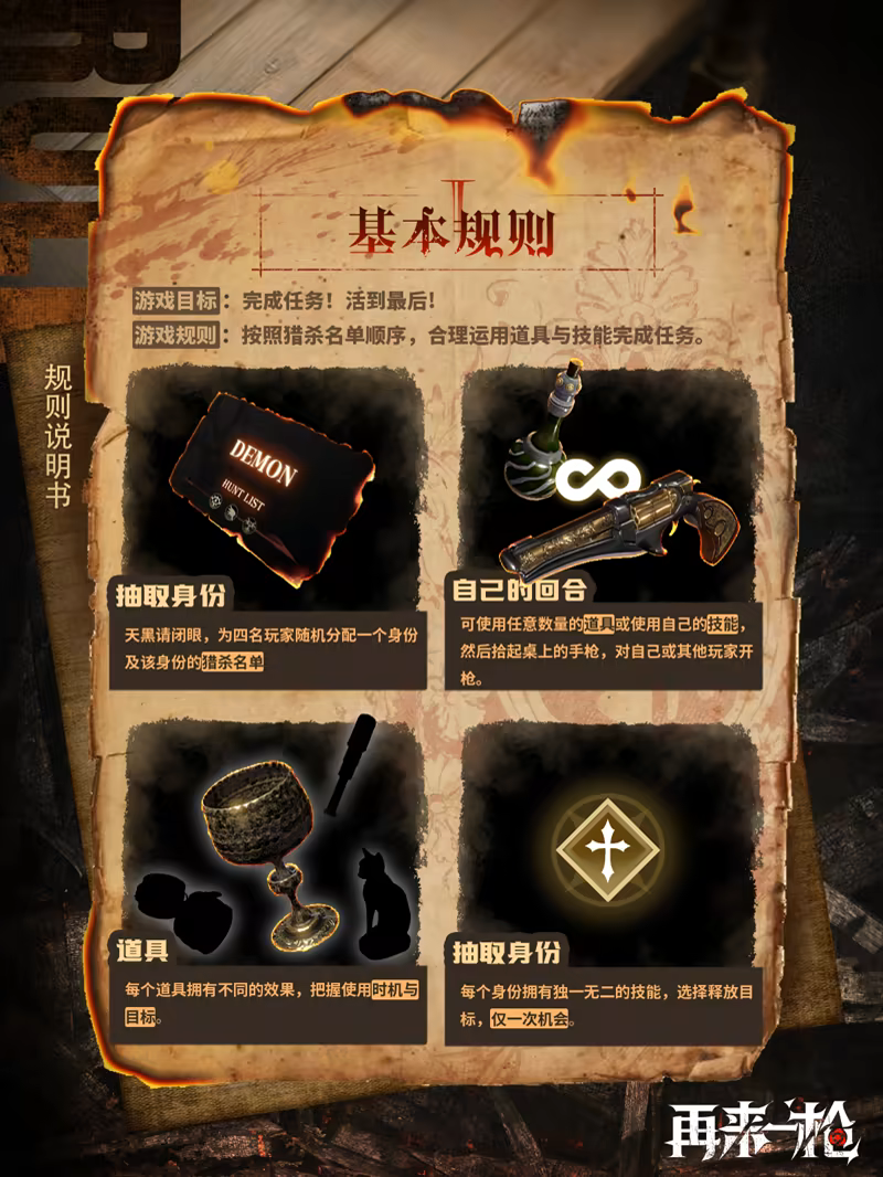 在这款结合了俄罗斯轮盘赌与身份欺诈的多人在线策略游戏中,你将随机获得身份【屠夫/邪徒/魔术师/药剂师】,每种身份暗藏专属胜利目标,保护自己身份同时推理出他人身份。巧妙使用道具,确认猎杀目标,Bang,再来一枪!