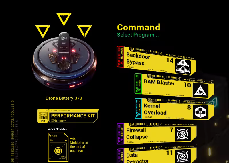 Pilot your drone around the city and perform hacks at various locations, that are hubs for criminal networks. Use hacking protocols in your deck to take down networks in the city. Upgrade hacks and purchase performance kits to enhance your hacking capabilities. Earn credits through successful hacks and purchase decor for your apartment.