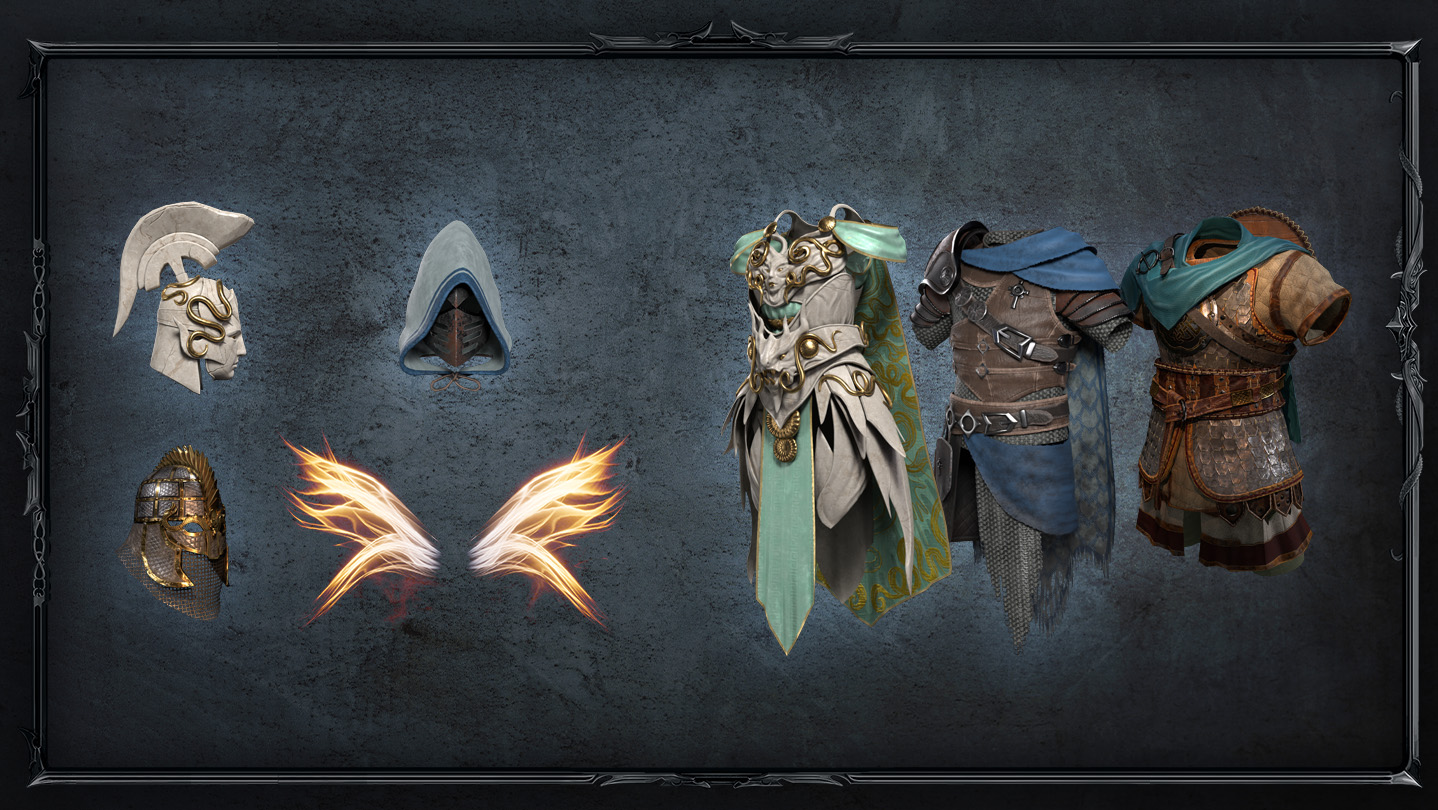 • 6 exclusive pieces of equipment including a chest and a helmet for your heroes (2 per character)