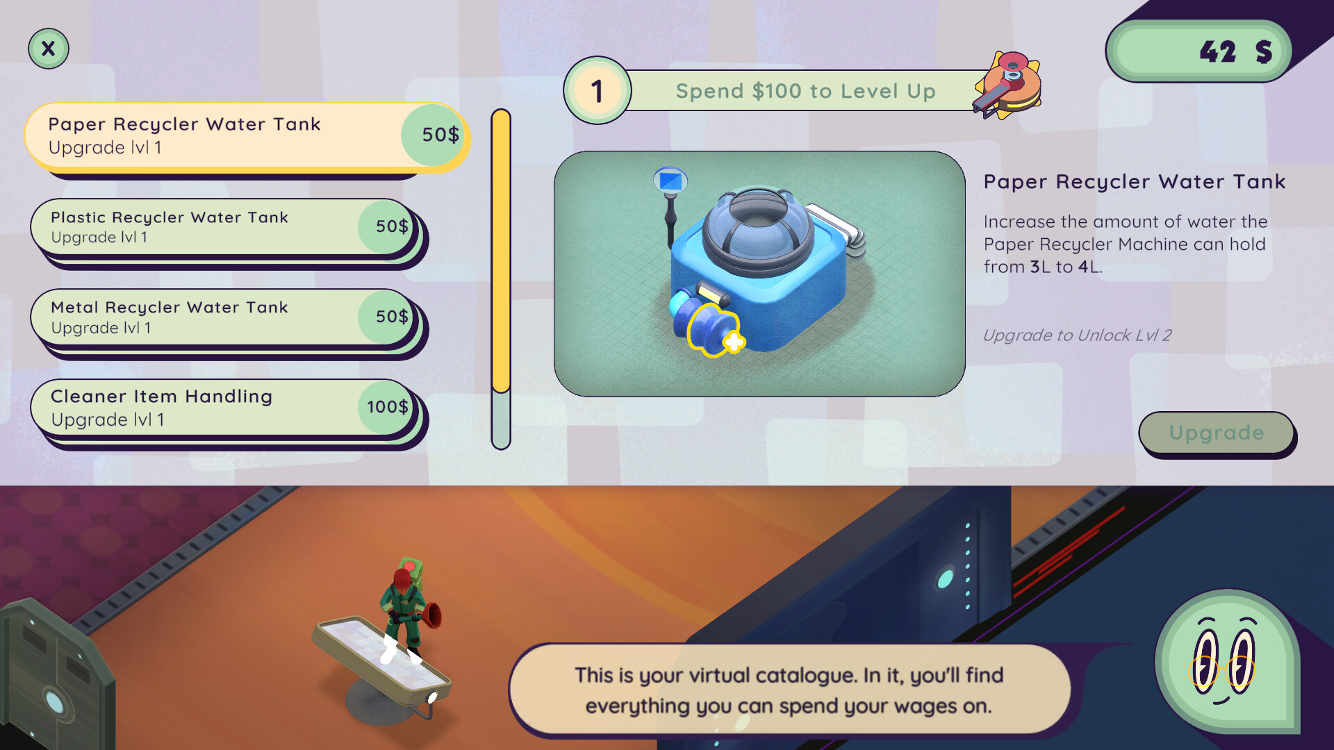 As you collect Space Coins from each recycling shift, you can invest them in upgrades - improving your machines, unlocking new perks, and enhancing your ship to take on bigger challenges. Whether it’s faster recycling gear, sturdier machinery, or ship systems that make your daily routine a little easier, every upgrade helps you stay ahead of the cosmic clutter.