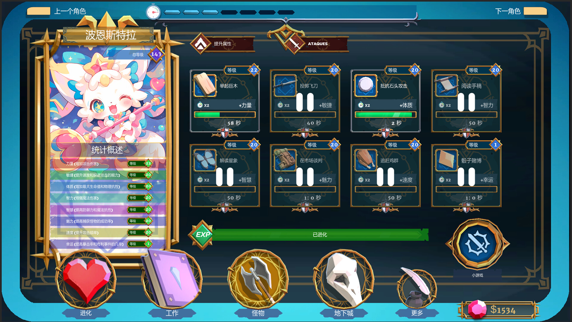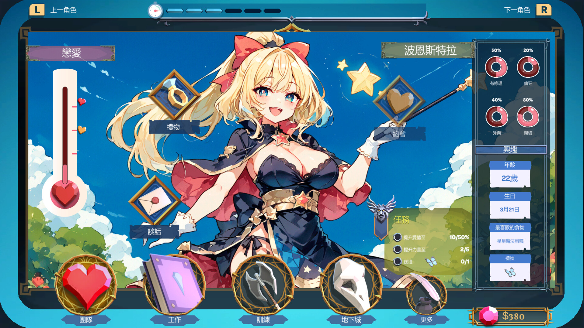 当你不在战斗(或调情)时,专注于升级你的基地吧。训练、提升技能,赚取金钱来装备自己!记住,即使是最伟大的冒险者,也需要一个舒适的地方来放松和社交!