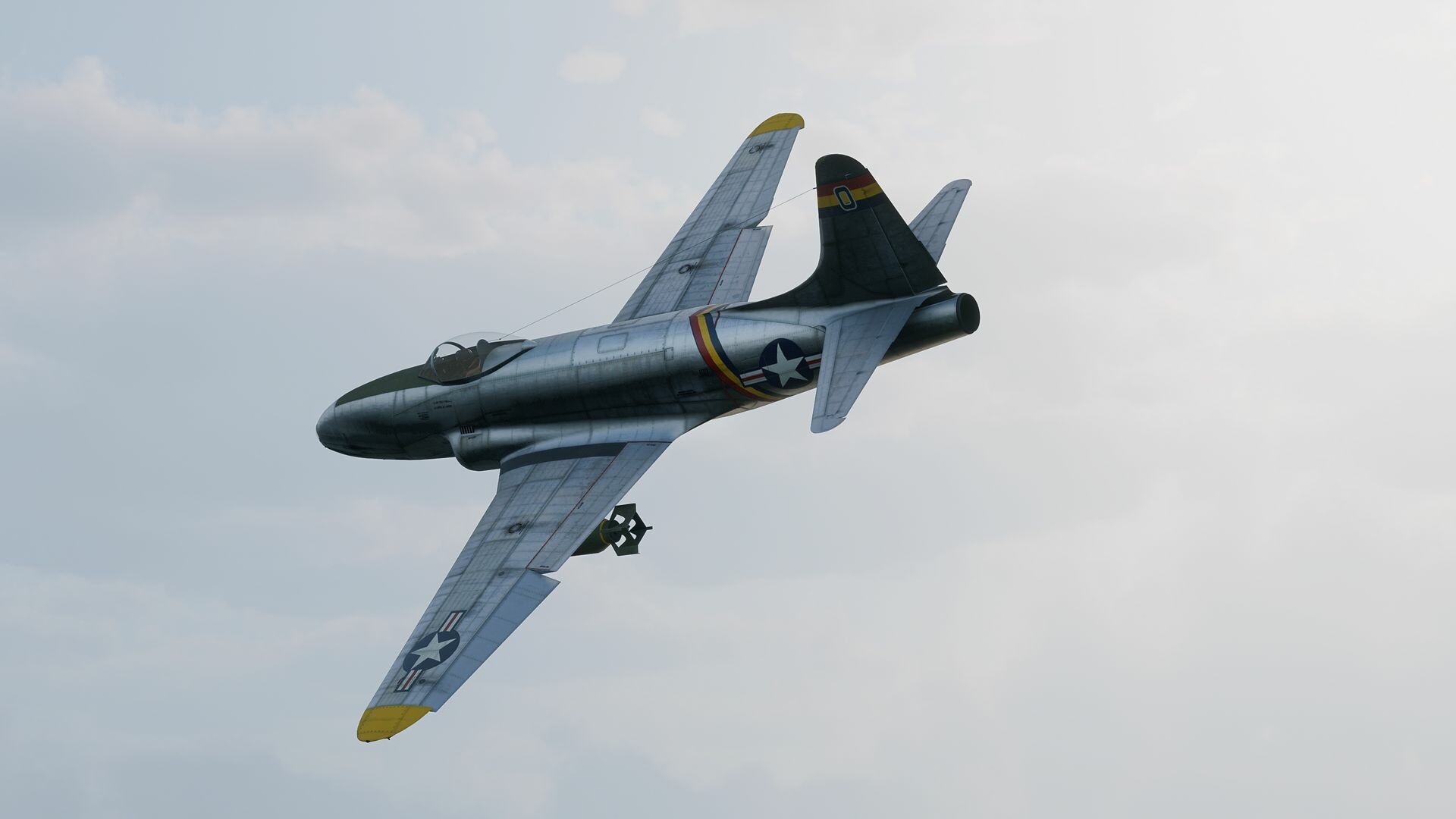 F-80A-5 Shooting Star är den första massproducerade stridsjeten från USA, utvecklad av Lockheed och tagen i drift 1945. Dess bestyckning består av sex M2 Browning-kulsprutor i nosen med totalt 1800 skott, såväl som två AN-M65A1-bomber på 450 kilo vardera. Även om F-80A-5 inte användes i faktiska strider under andra världskriget, blev den en betydande milstolpe i utvecklingen av jetflyget. Flygplanet användes till pilotutbildning och som en plattform att testa nya tekniker med.