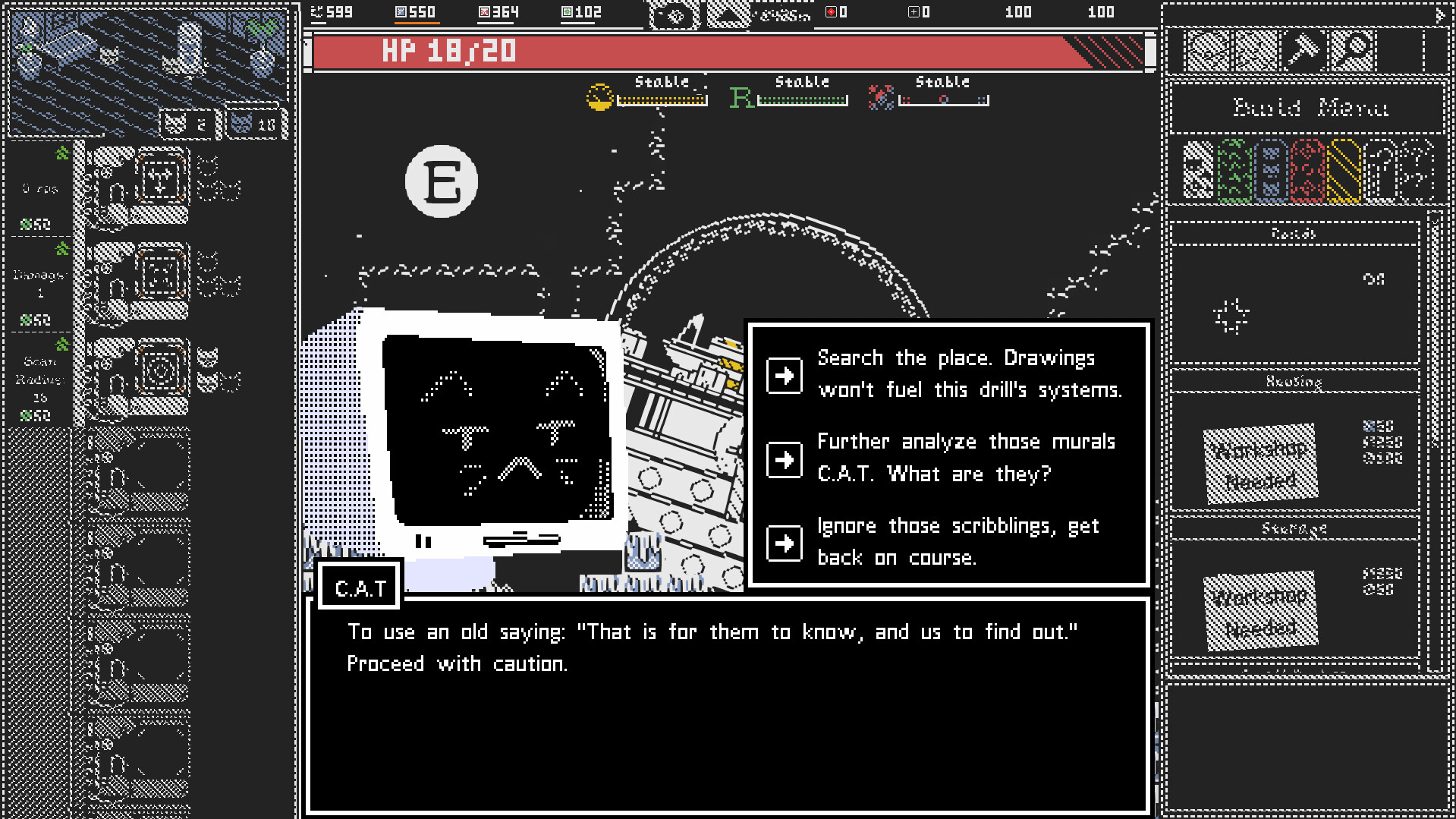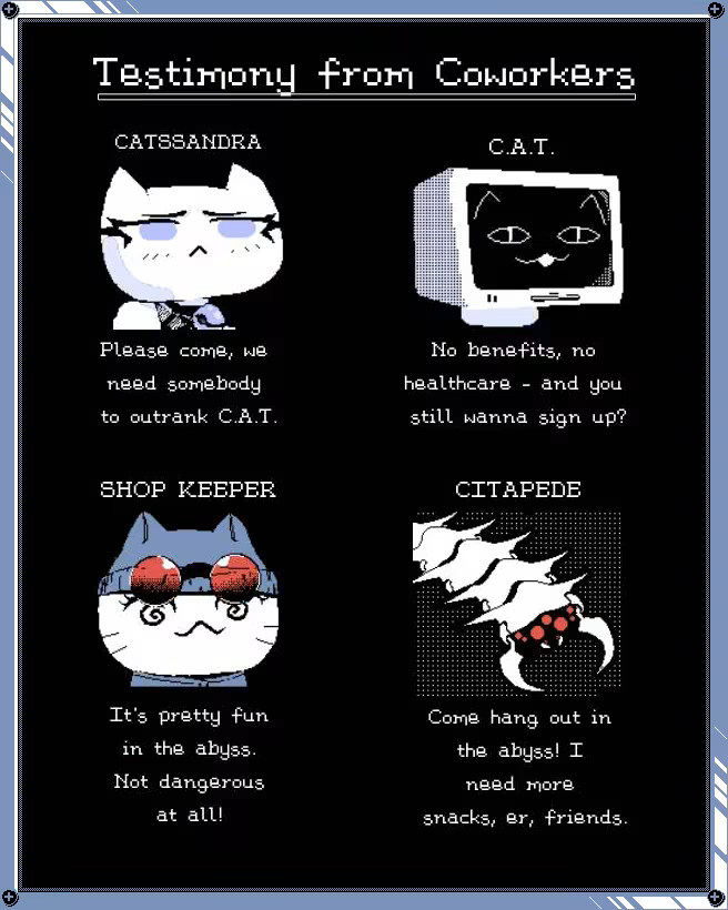 Citadrill is recruiting ambitious self-starters to become remote operators! Tired of your office job? Then come shepherd a moving base in an exciting and dynamic workplace called the ✨abyss✨. Drill for resources, build weapons, and decide how to allocate materials. Every decision will count as you manage your cat-izens, explore hazardous environments, and fight off monsters. Don't fret if one expedition ends in disaster— you can always start a new run!