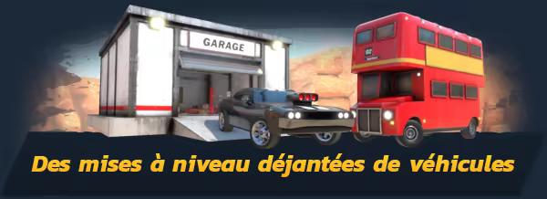 En utilisant les turbos nitro, vous augmentez la capacité en nitro du véhicule et en roulant à toute vitesse, vous augmentez sa vitesse maximale... Vous me suivez ? En maximisant toutes les statistiques d'un véhicule, vous augmentez votre niveau de joueur et vous pouvez acheter de nouveaux véhicules ou des personnalisations. Collectionnez plus de 50 véhicules et personnalisez-les avec des antennes, des turbos et des plaques d'immatriculation uniques portant votre nom en jeu. Atteignez le niveau max de joueur pour avoir accès au prestige et montrer qui commande dans Crash Drive 3 ! Qui veut un véhicule en or massif ?