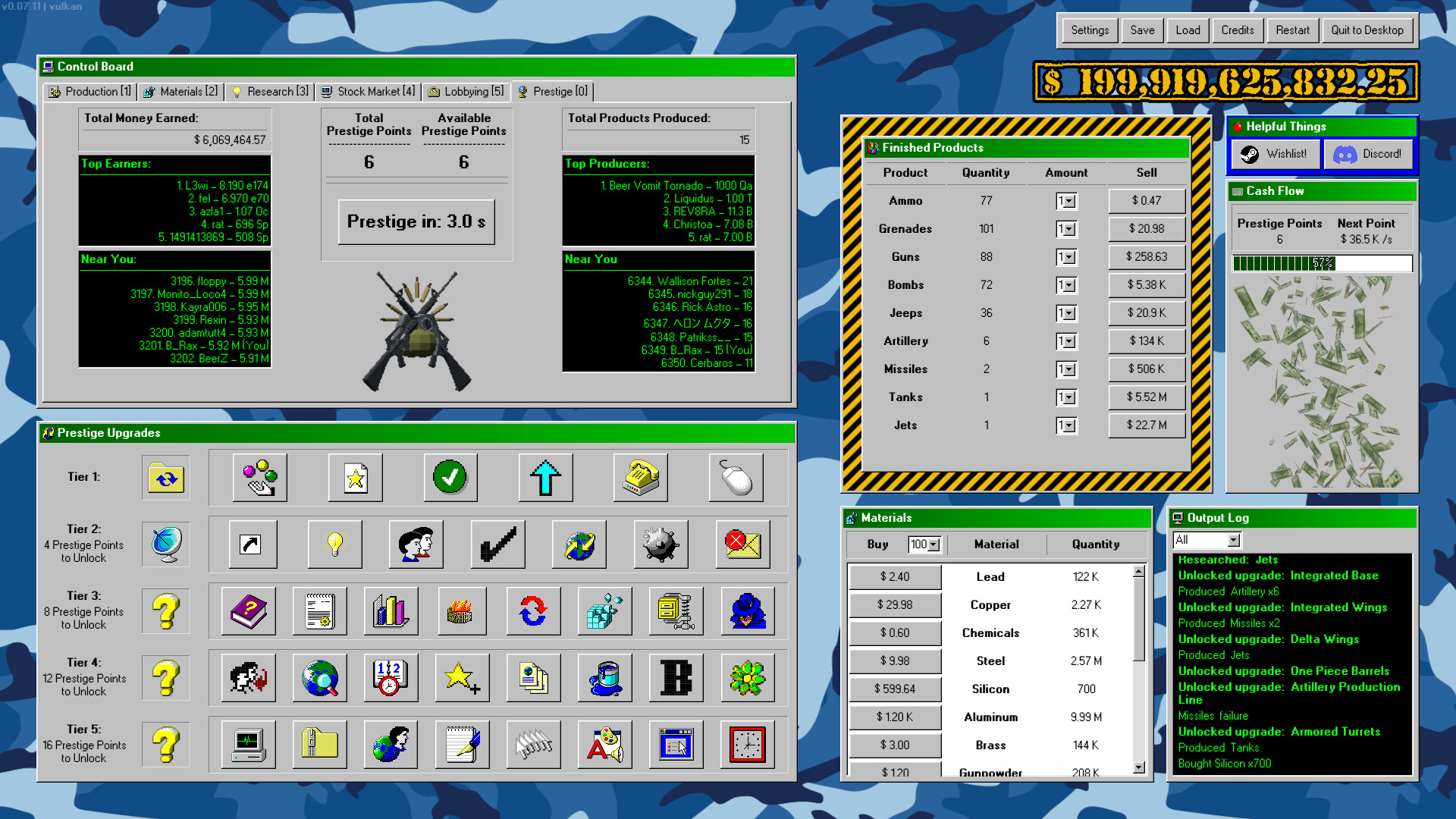 Make weapons, make money. An active incremental game where you amass as much money as you can by starting a Military Industrial Complex company. Produce multiple different weapons, research upgrades, manipulate the stock market, and lobby the government for favors.