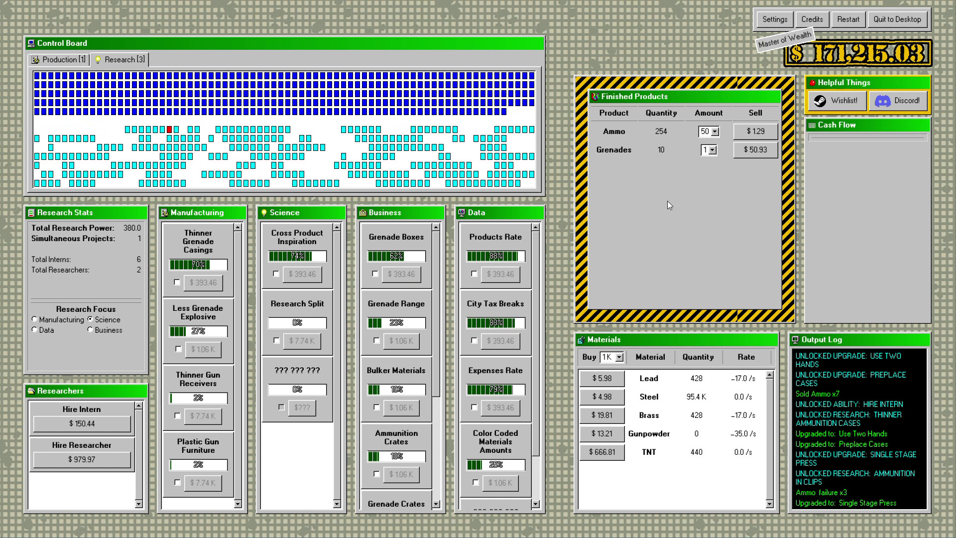 Make weapons, make money. An active incremental game where you amass as much money as you can by starting a Military Industrial Complex company. Produce multiple different weapons, research upgrades, manipulate the stock market, and lobby the government for favors.