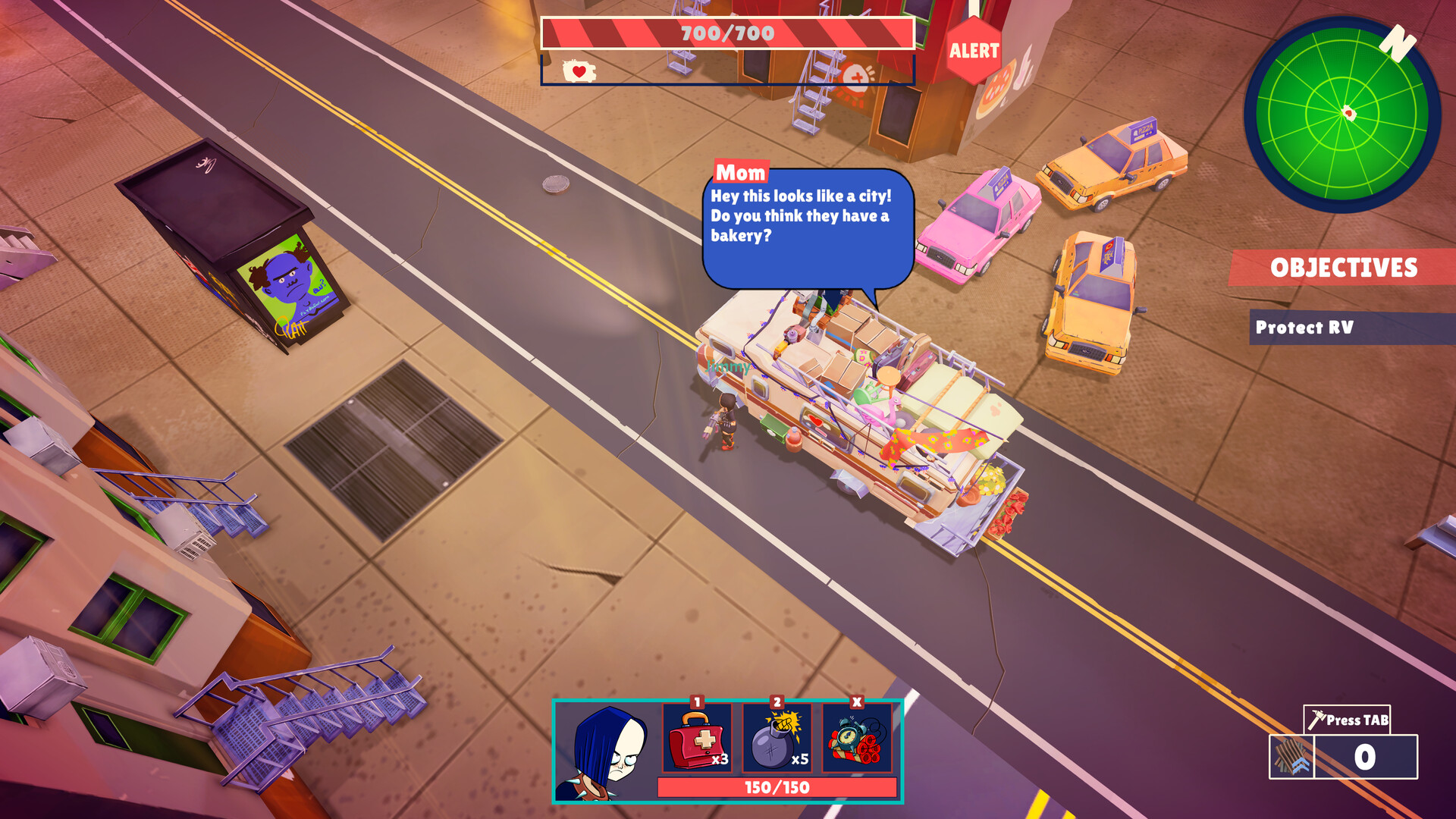 A co-op action game about protecting your mom in a post-apocalyptic world. Explore ruined cities, gather resources, upgrade your motorhome, build defenses, and battle enemies. Your mission: Get Mom to safety. Her survival is in your hands!