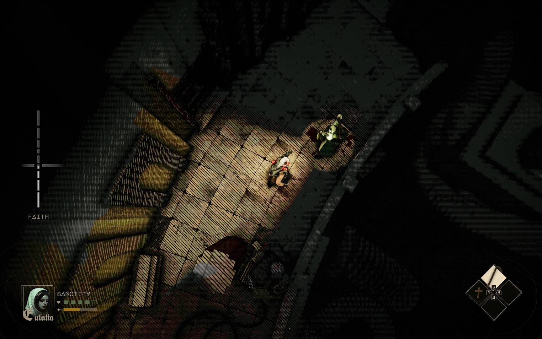 • Manage your faith through different violent or non-violent actions. Your faith will help you navigate the Basilica, and give you access to Saintly or Cursed items and buffs.