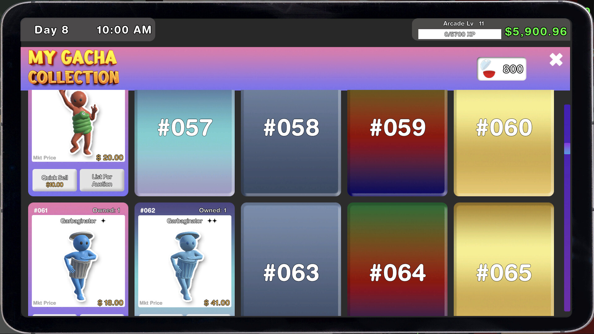 Step into a world of arcade nostalgia where you manage and expand your own arcade, while collecting over 500 Gachas to trade and sell.