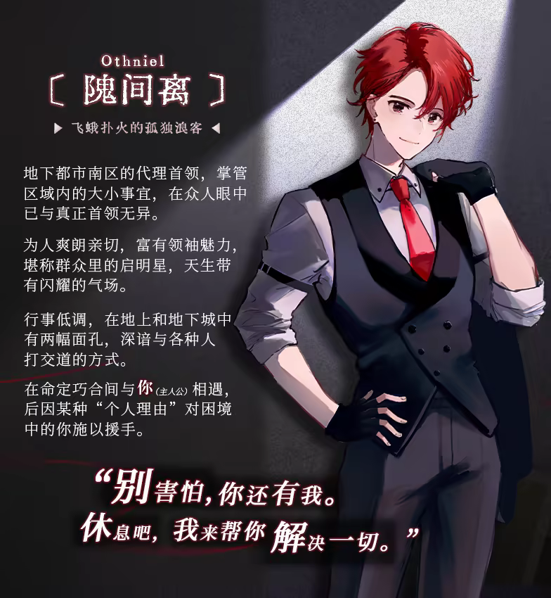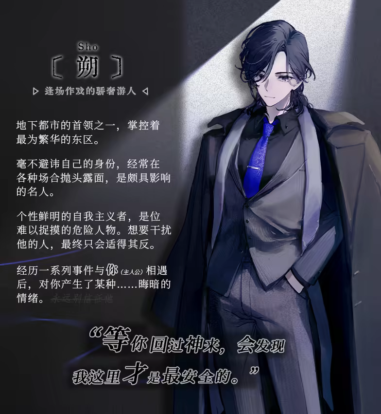 这位仿佛将“我就是最终boss”写在脸上的人,刚开场就引来了难以预料的祸患。他对你的威胁如影随形,而且似乎很乐于将你拖进灾厄的中心……这种堪称病态的情感究竟是恶意,玩乐心,还是某种更扭曲,更晦涩,难以言明的……爱?不论如何,现在要做的事只有一件——那就是挣脱朔的圈套,亮起獠牙,完成从猎物到猎手的逆袭!