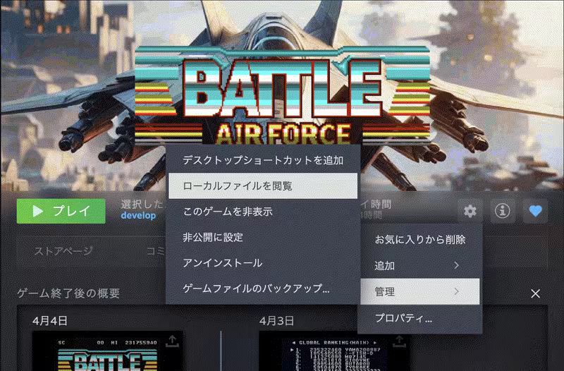 • Steamクライアントで Battle AirForce の Settings (歯車アイコン) をクリック