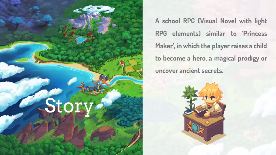 Mistel Garden is a school RPG/fantasy Visual Novel similar to ‘Princess Maker’. The player raises a child to become a hero, a magical prodigy or uncover ancient secrets. You choose various school lessons, work and activities to navigate the events of the story and (hopefully) get a good ending!