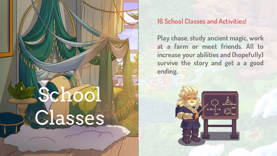 Mistel Garden is a cozy school RPG/fantasy Visual Novel similar to ‘Princess Maker’. The player raises a child to become a hero, a magical prodigy or uncover ancient secrets. You choose school lessons, work and activities to navigate the events of the story and (hopefully) get a good ending!