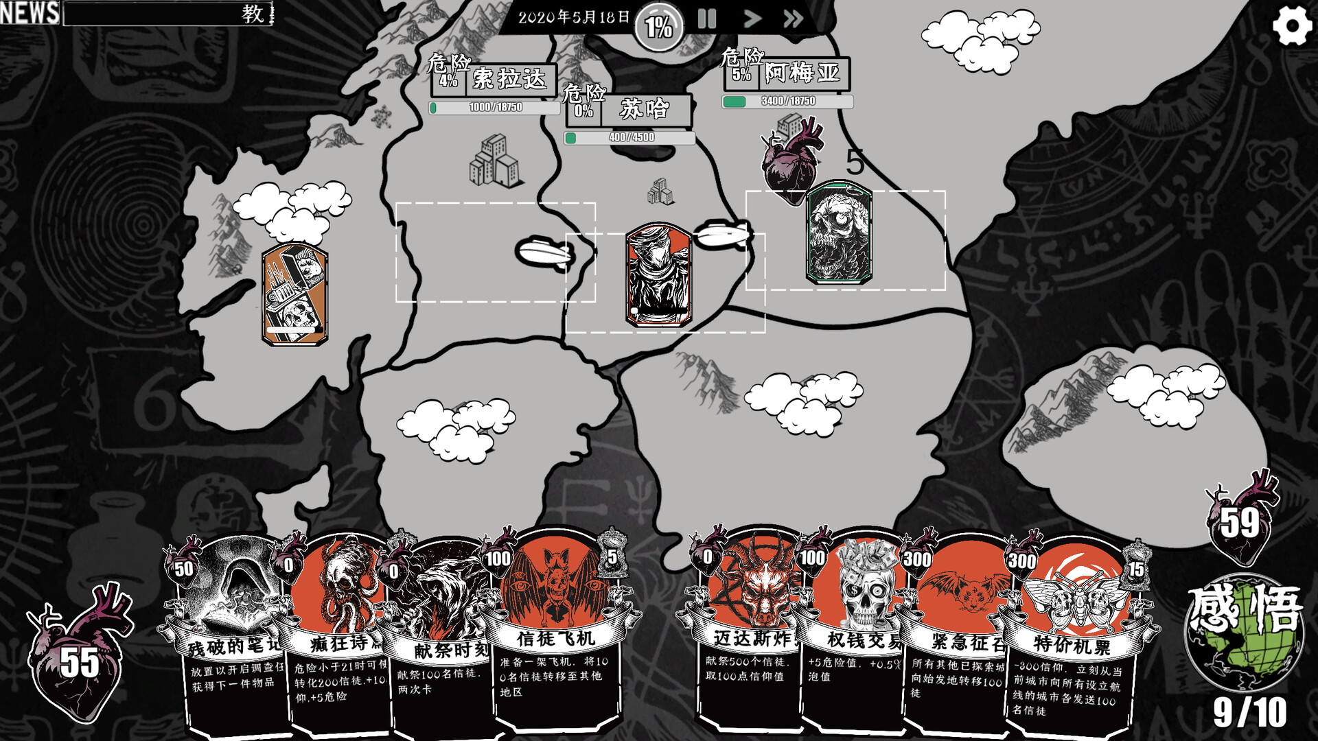 This is a simulation management game with a Cthulhu-themed idle card gameplay mechanic. Players take on the role of the founder of a church, spreading their religion across a fictional continent.Players need to draw cards from a deck containing hundreds of cards with various functions, then use gold coins and other resources to play those cards in the city, with the ultimate goal of converting people all over the world into their followers.