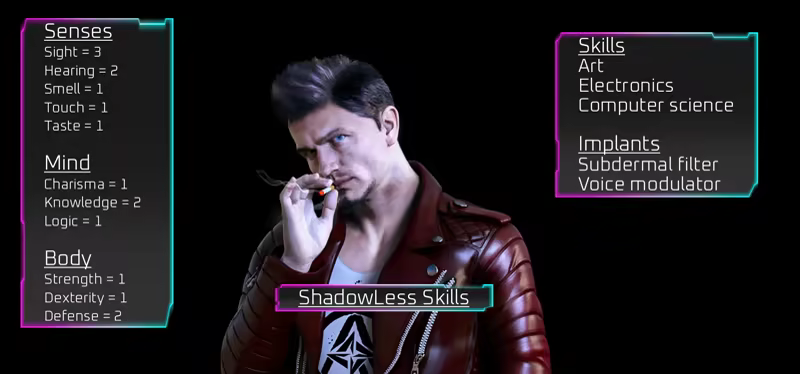 ShadowLess Light is a visual novel with role-playing elements. You can create and customize your character attributes, skills and cybernetic implants.