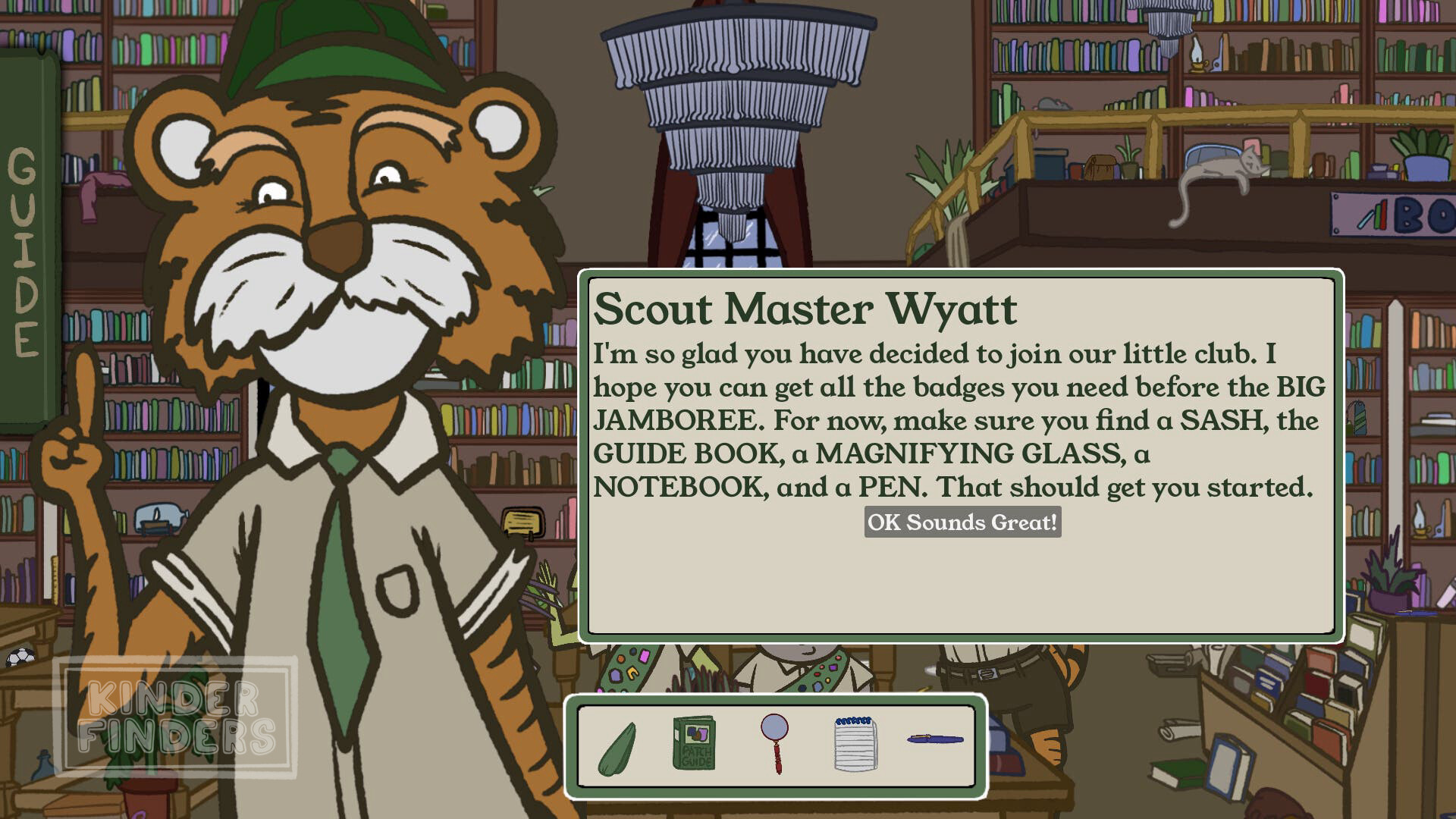Welcome to the Kinder Finders. The Annual Jamboree is coming up so make sure to get out there and find some ways to be kind, and earn those badges. Help people by searching for their lost items all throughout the hand drawn cozy city. Your click and find adventure begins: NOW!
