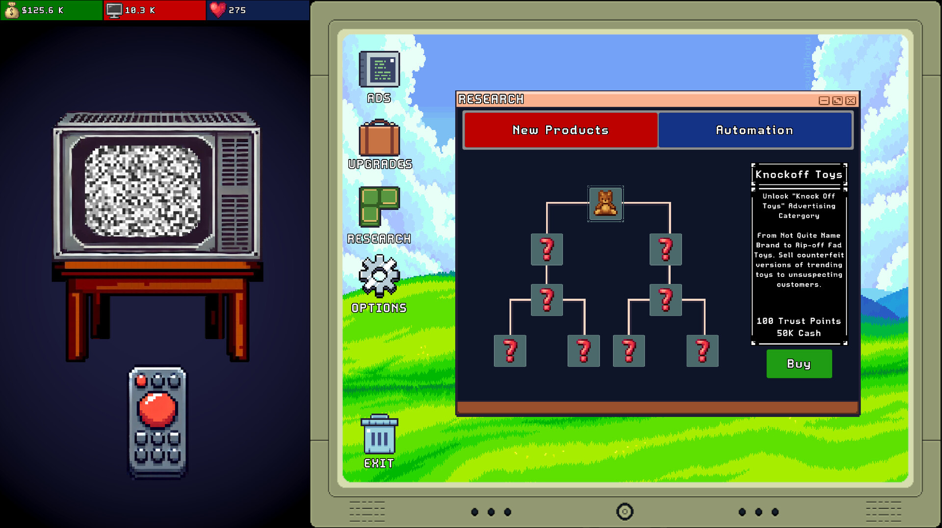 • Hire shady managers, unlock advanced upgrades, and automate your infomercial empire to generate viewers and cash while you sleep. Scale your operations from a single channel to a global media scam network, reaping massive rewards with minimal effort.