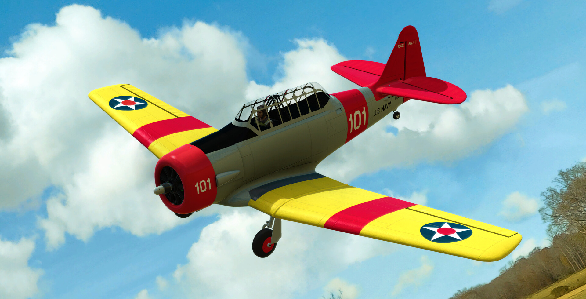 The airframe is factory-finished in an iconic scheme based on the SNJ-5 “101,” which is still being flown by High Sky Wing – a unit of the Commemorative Air Force based in Midland, Texas. It features a variety of scale details, including molded-in panel lines, a simulated radial engine, a detailed cockpit with a pilot figure, and more. Plus, its functional flaps and retractable landing gear add to the scale flying experience.