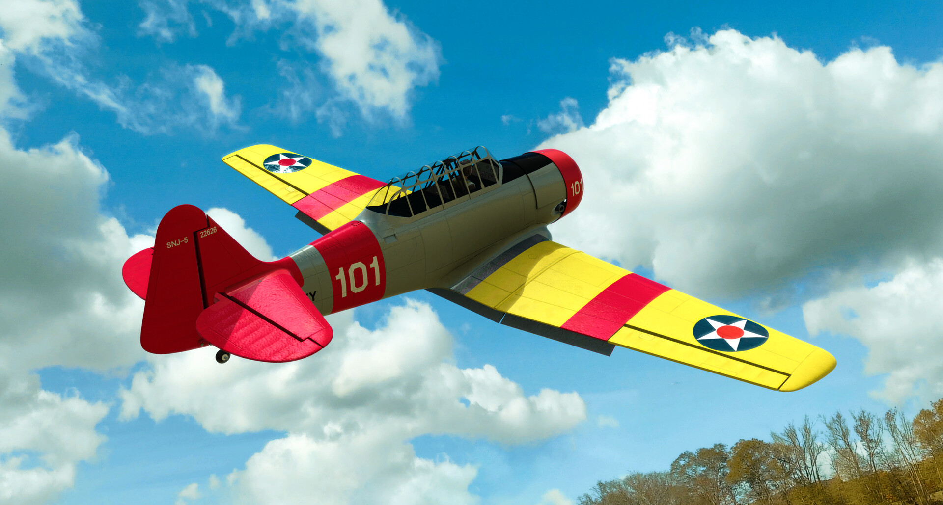 The airframe is factory-finished in an iconic scheme based on the SNJ-5 “101,” which is still being flown by High Sky Wing – a unit of the Commemorative Air Force based in Midland, Texas. It features a variety of scale details, including molded-in panel lines, a simulated radial engine, a detailed cockpit with a pilot figure, and more. Plus, its functional flaps and retractable landing gear add to the scale flying experience.