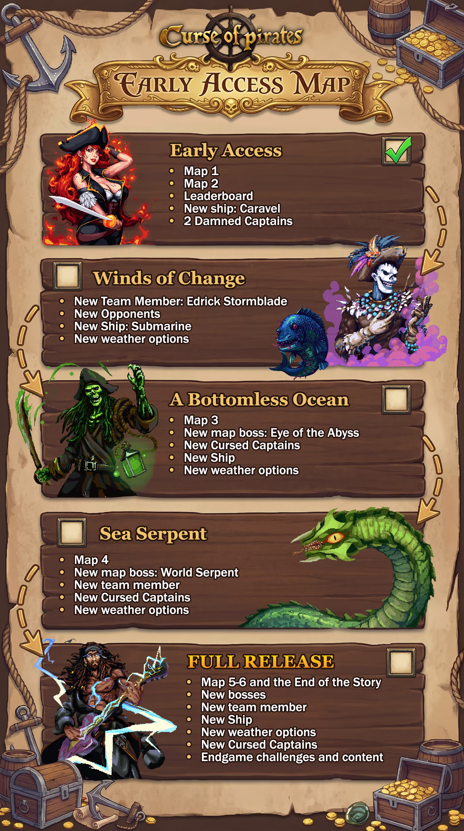 “Version 1.0 of Curse of Pirates will differ significantly from the Early Access version of Curse of Pirates. In Version 1.0, we plan to add a variety of player ships—each with its own unique passives and gameplay. There will be even more characters with their own skill pools, as well as new bosses, challenges, and the conclusion of the main story. ”