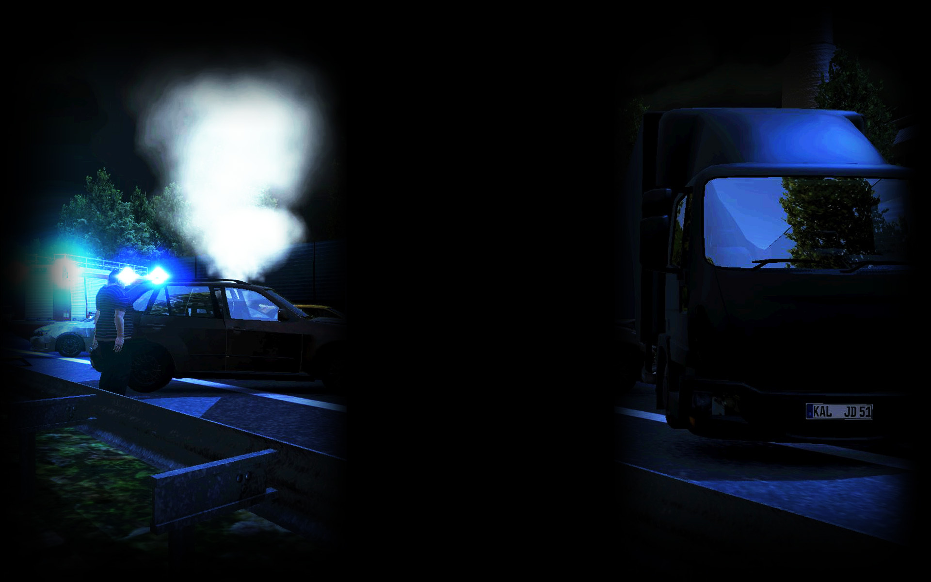 In addition to the 40 missions revolving around the daily duties of the Autobahn Police, one can enjoy the extensive “Free Play” mode. This mode generates random radio calls for operations which the player is free to accept. All in all, this mode includes 100 additional operations at various locations and times of day. Accidents can be more or less severe and can also include trucks. The fully equipped patrol car houses all material needed to secure and inspect the accident site. Emergency vehicles, fire trucks and rescue services complete the scene at the accident.