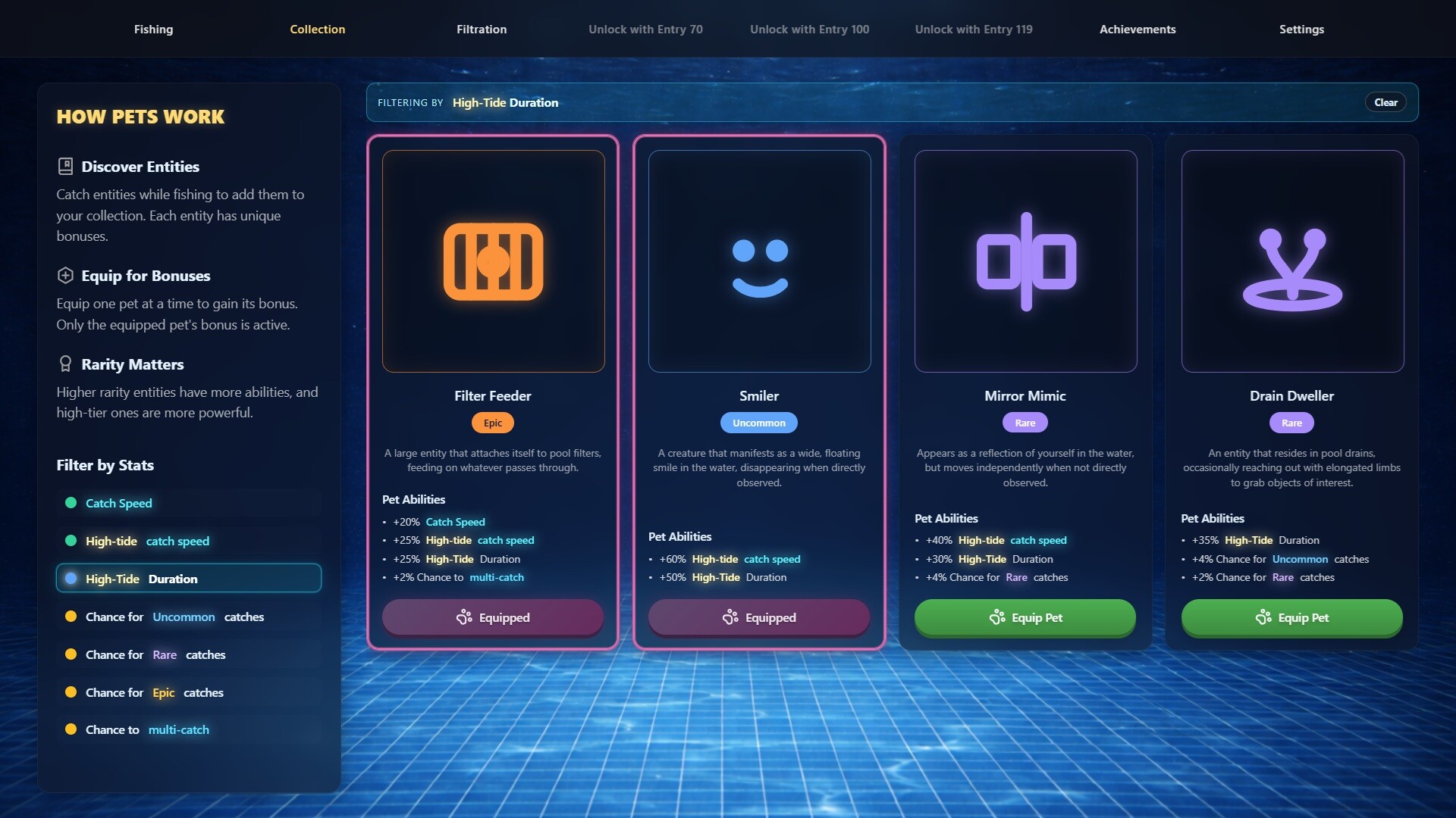 COLLECT PETS - Document your catches in a detailed collection system. Choose them as your pet and companions to progress even faster through the pools.