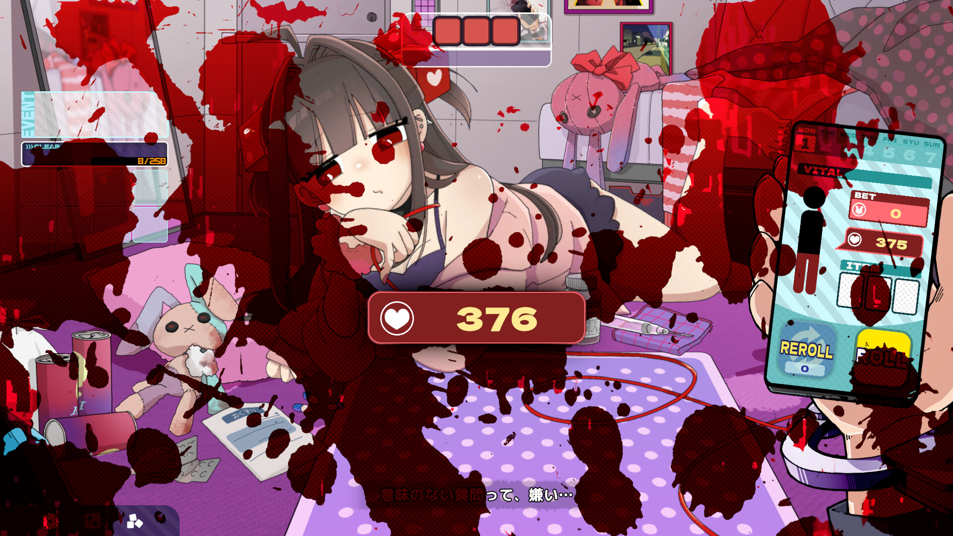 (本作は『メンヘラリウム』のデモ版となります) 「私と死ぬまで遊んでよ♡」『メンヘラリウム』は、超メンヘラな女の子に血を賭けたチンチロで勝ち続ける、デッキ構築ローグライトゲームです。 あなたは超メンヘラな女の子に監禁され、血を賭けたチンチロを毎日行わなければいけません。 彼女から突き付けられる理不尽なルールを、出目を改造したりイカサマアイテムを使って突破し7日間を生き延びましょう。