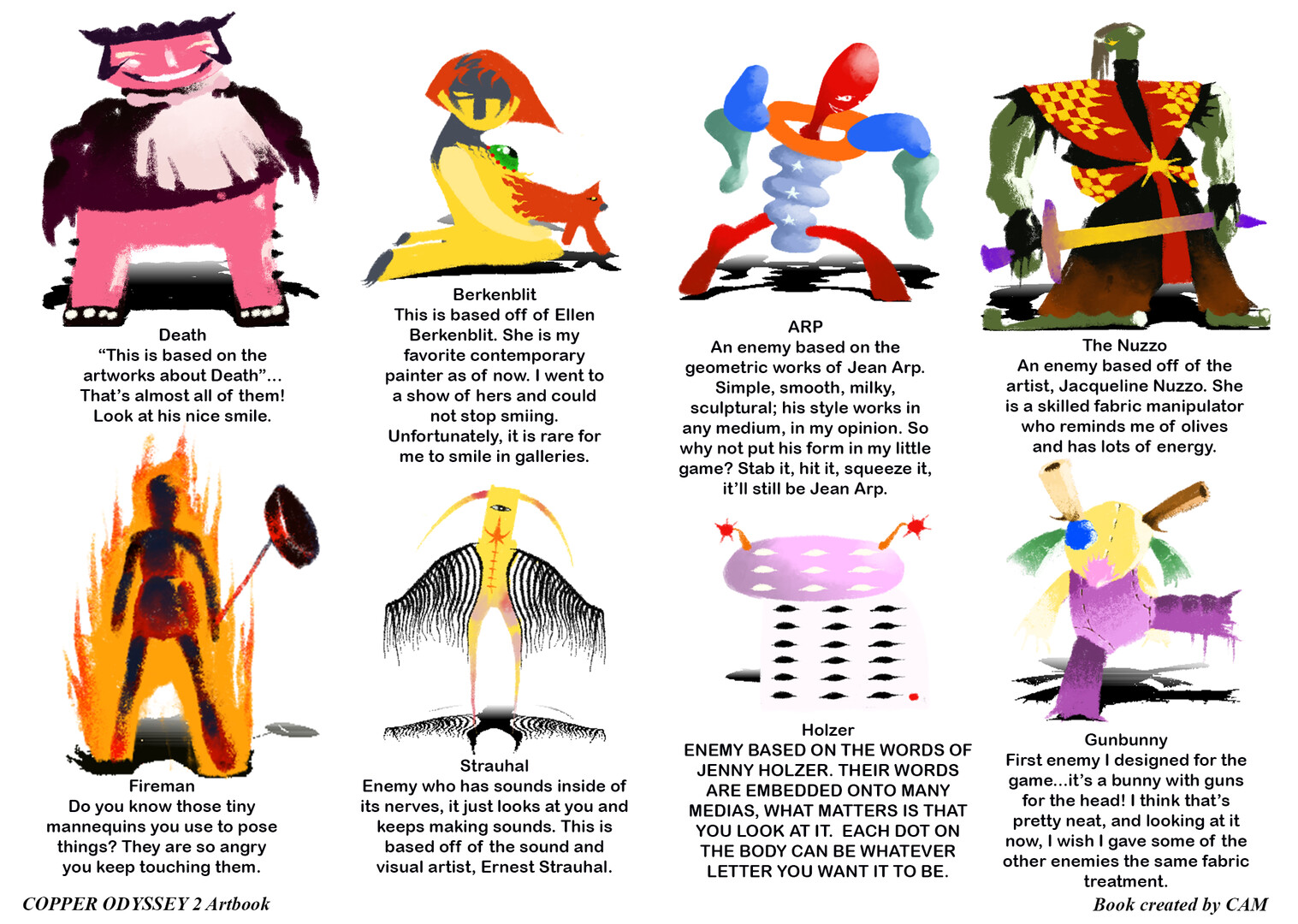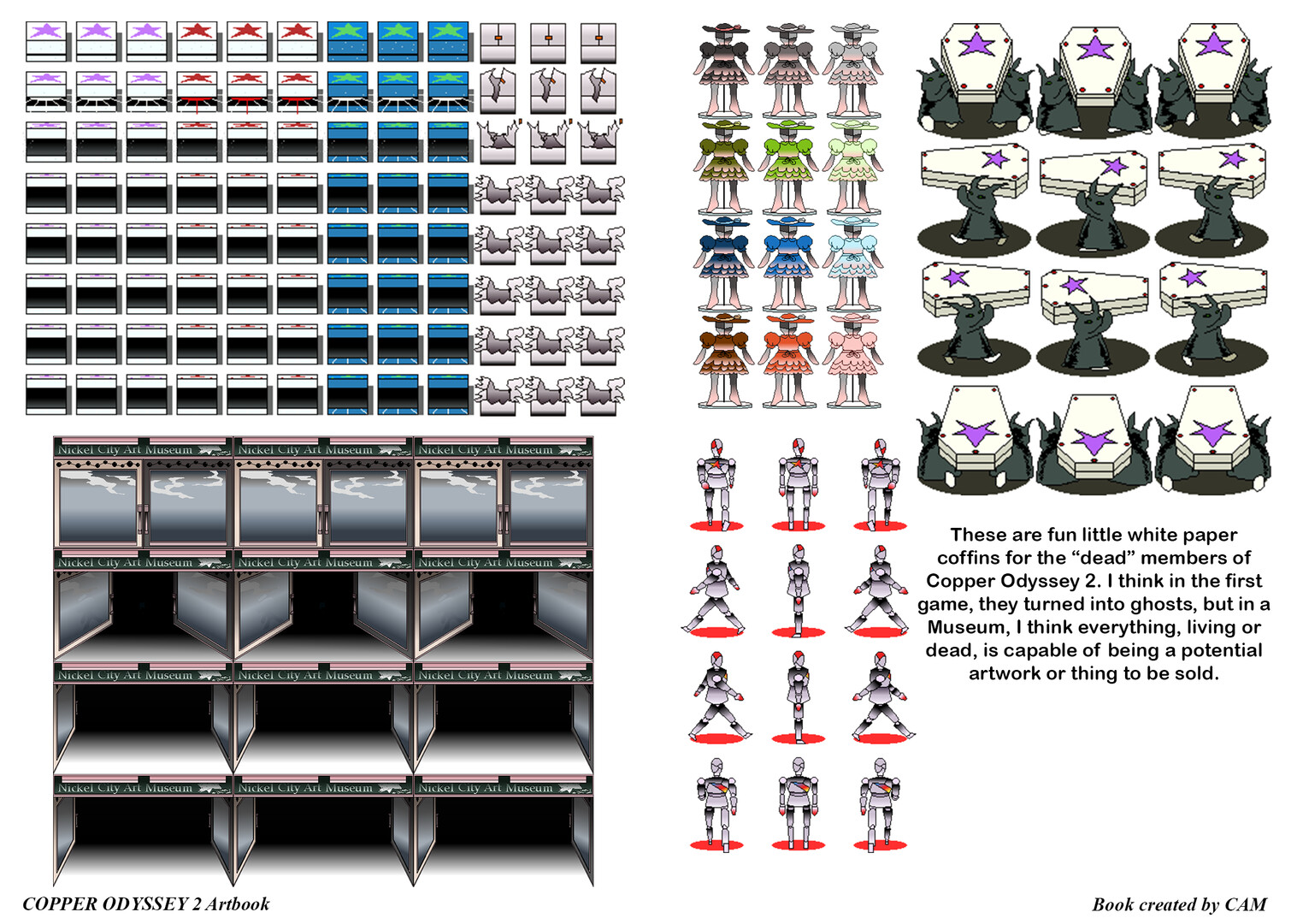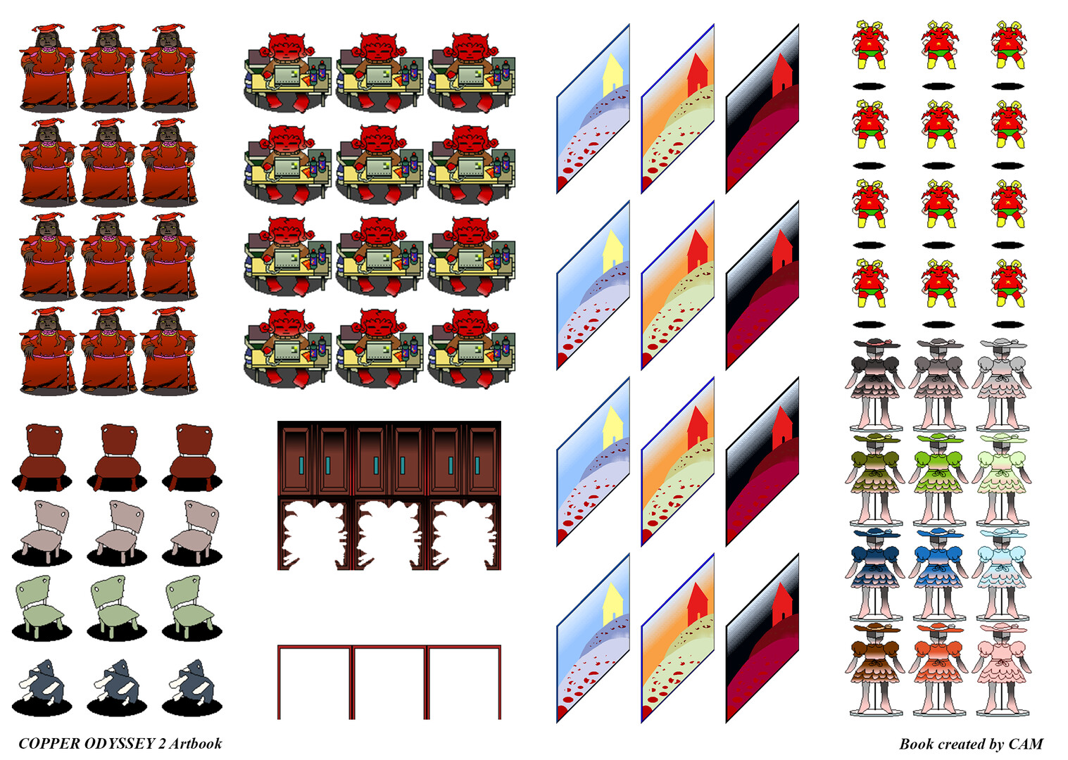 This is the 87 page artbook for the videogame, Copper Odyssey 2, a game by CAM. This artbook contains 99.9% of assets used in the videogame, alongside unused assets and even commentary from the creator.