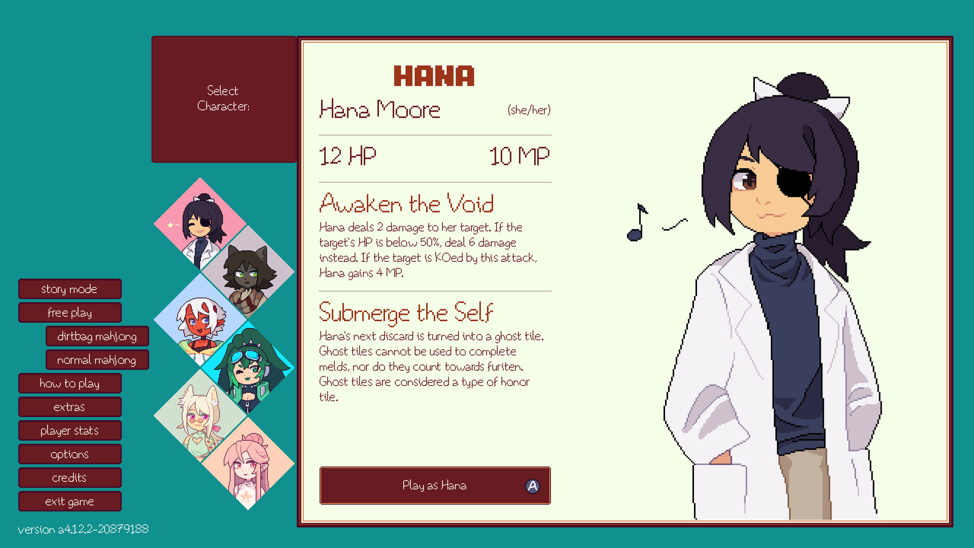 Choose your character and join five other dirtbags for a night of riichi mahjong and misdemeanor assault. Nobody here plays fair, and they've all got some dirty tricks up their sleeves.